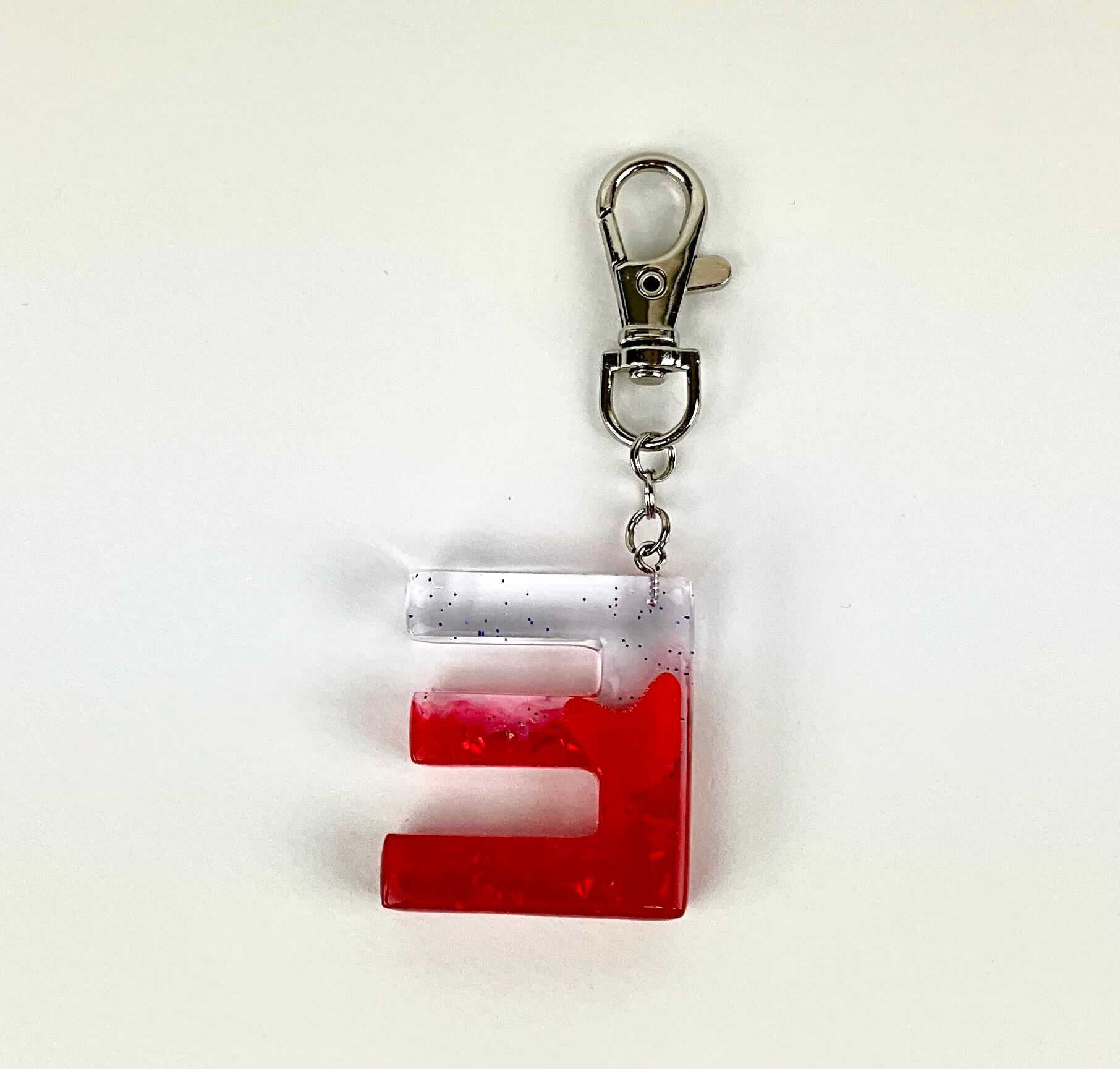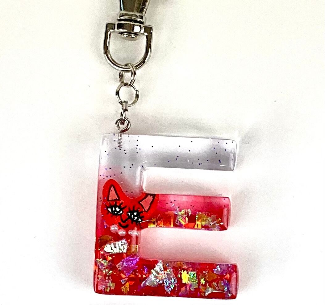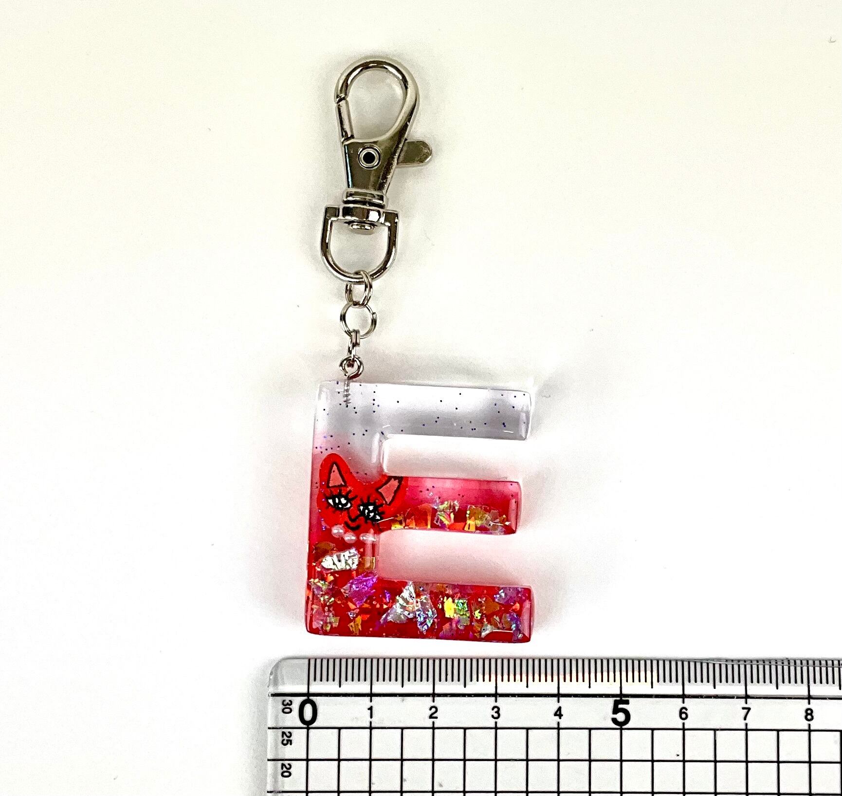 人気のアルファベットEのキーホルダーです。レジンを使用して作成されており、透明感が美しい仕上がりとなっています。
