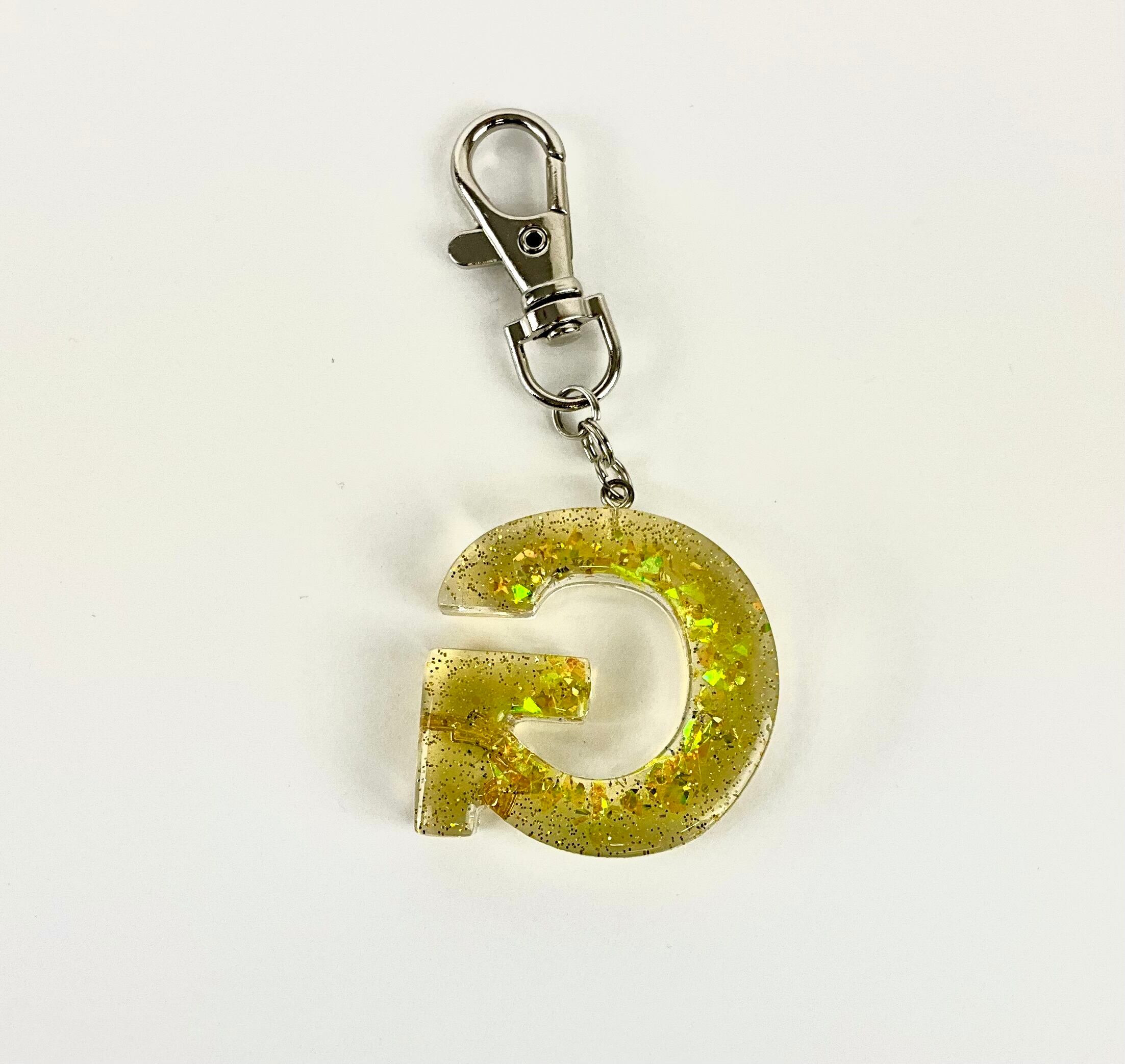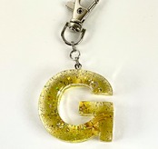 人気のアルファベットGのキーホルダーです。レジンを使用して作成されており、透明感が美しい仕上がりとなっています。
