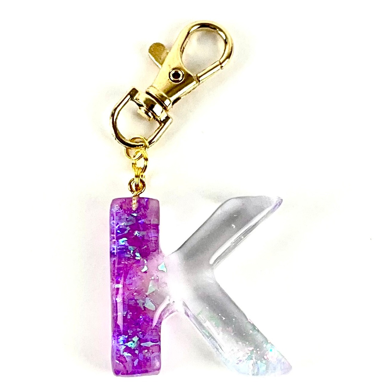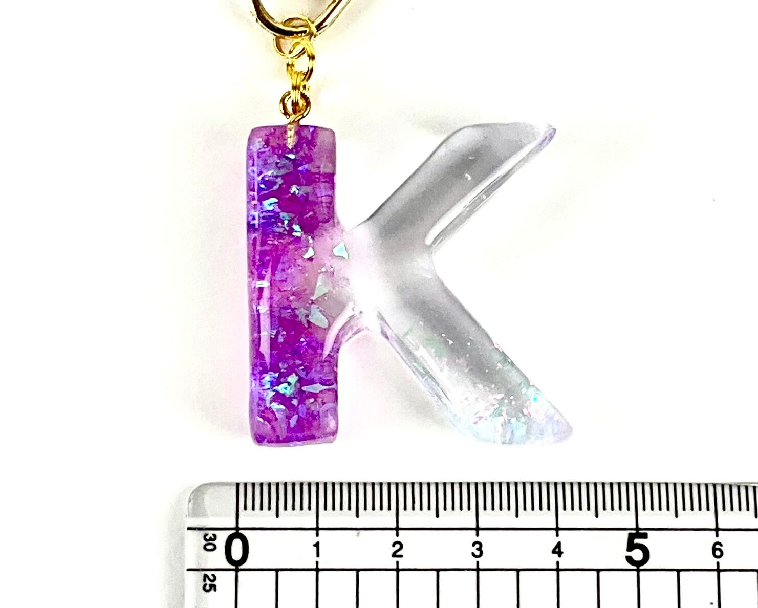 人気のアルファベットKのキーホルダーです。レジンを使用して作成されており、透明感が美しい仕上がりとなっています。