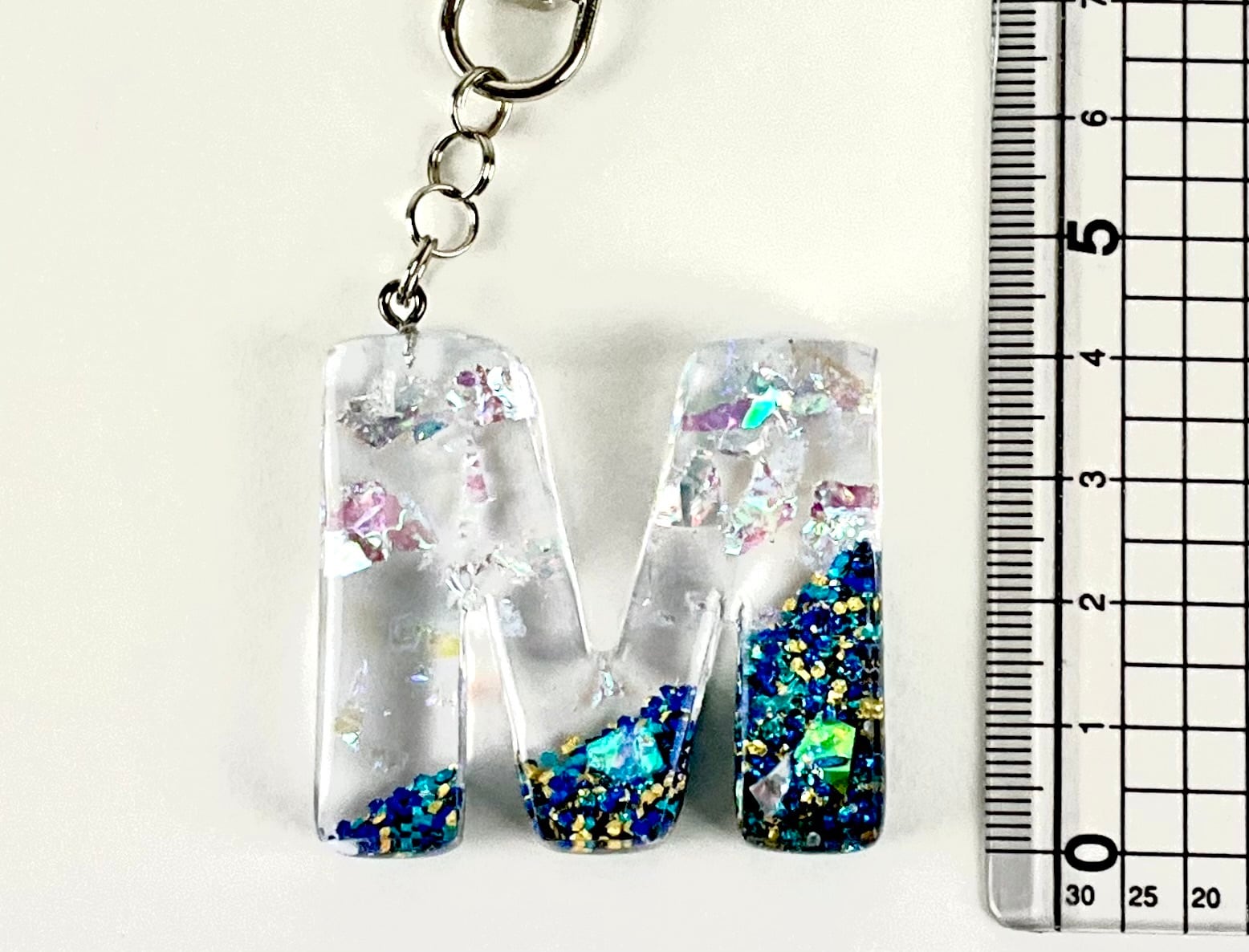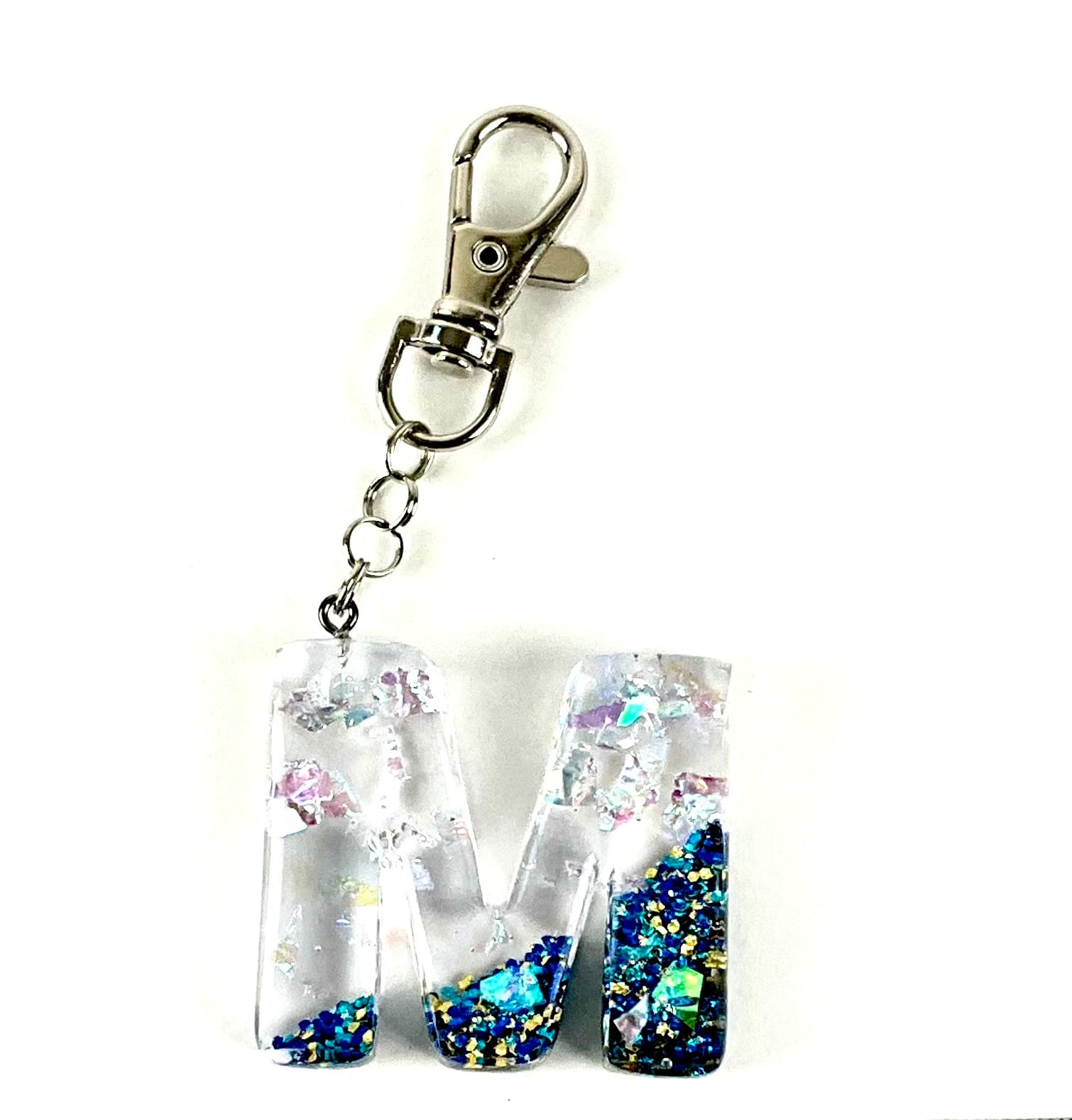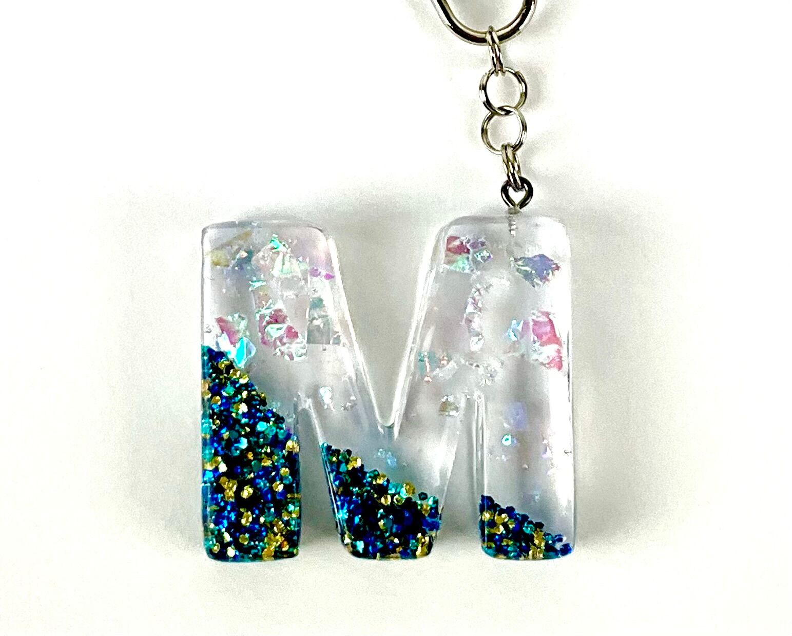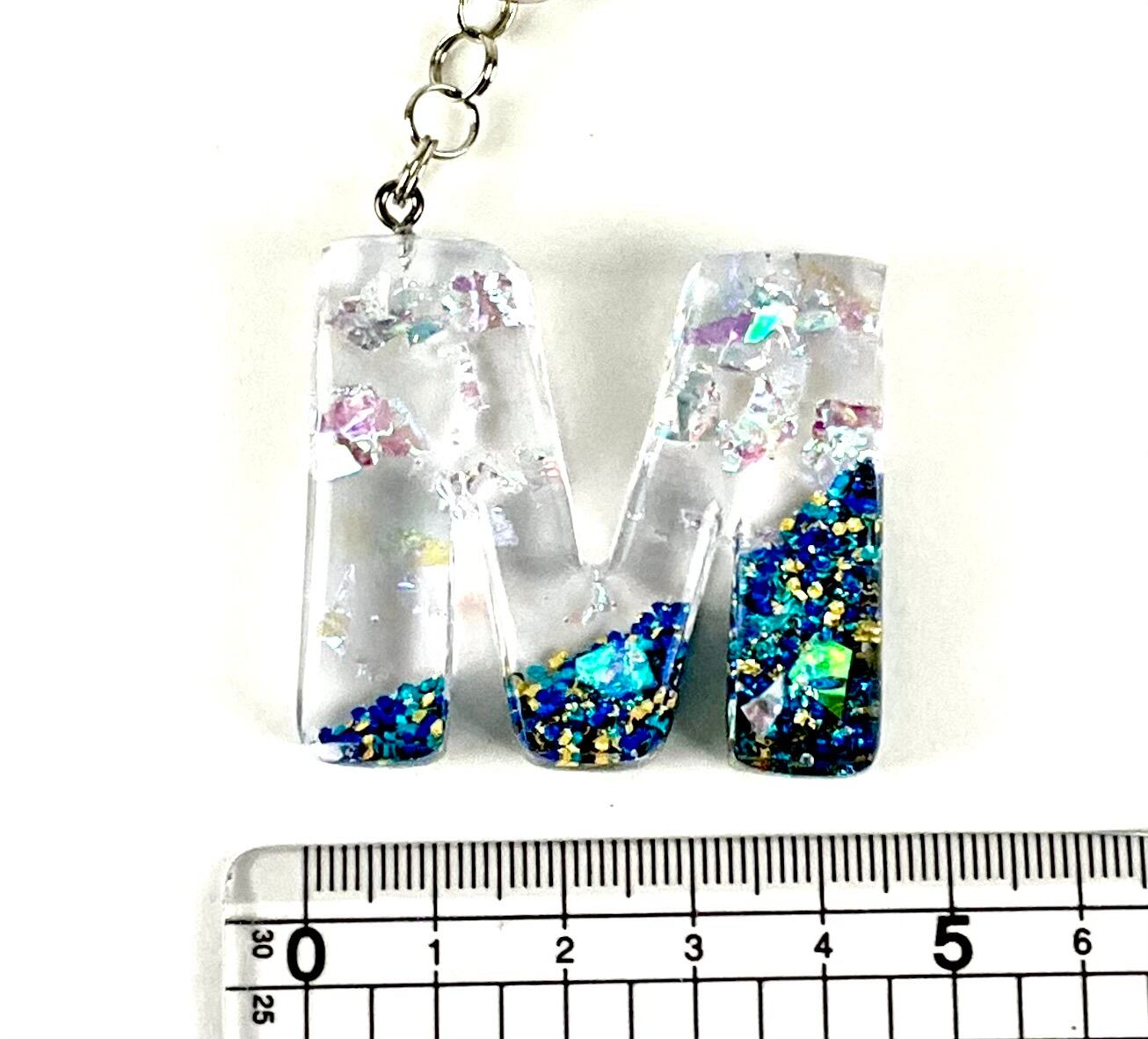人気のアルファベットMのキーホルダーです。レジンを使用して作成されており、透明感が美しい仕上がりとなっています。