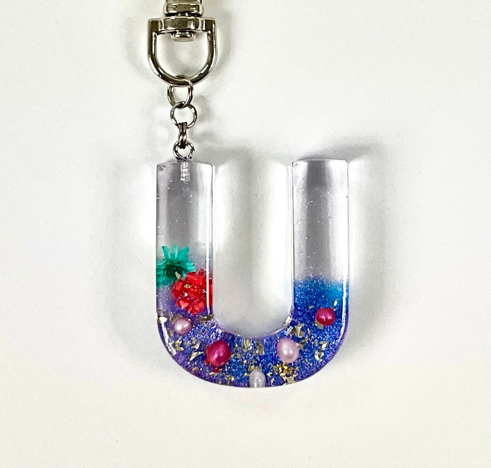 人気のアルファベットUのキーホルダーです。レジンを使用して作成されており、透明感が美しい仕上がりとなっています。