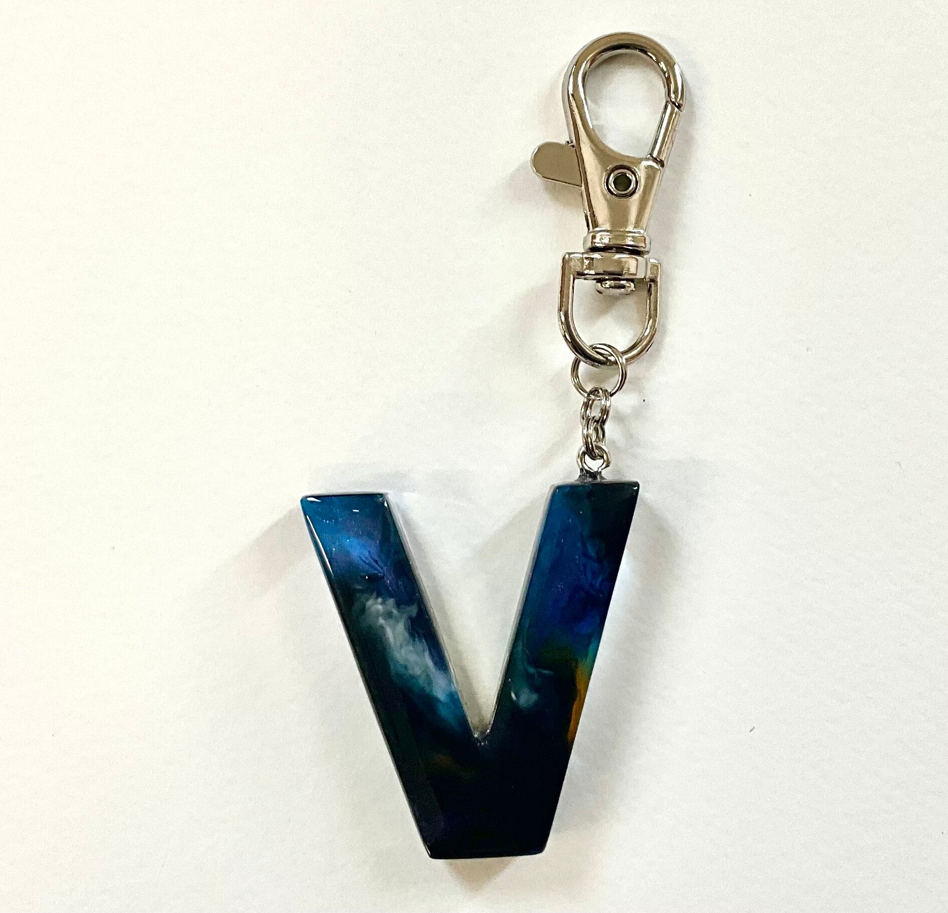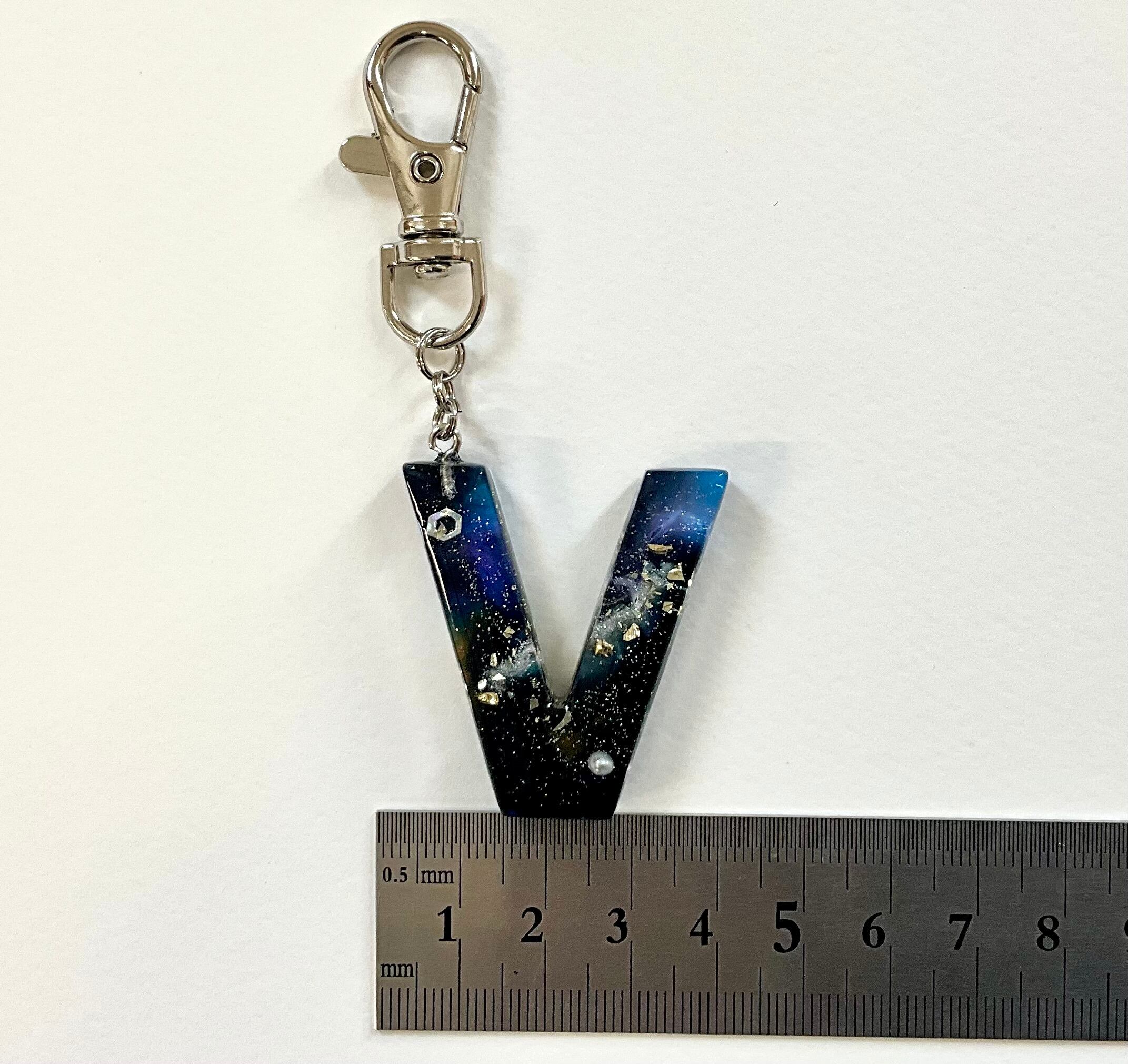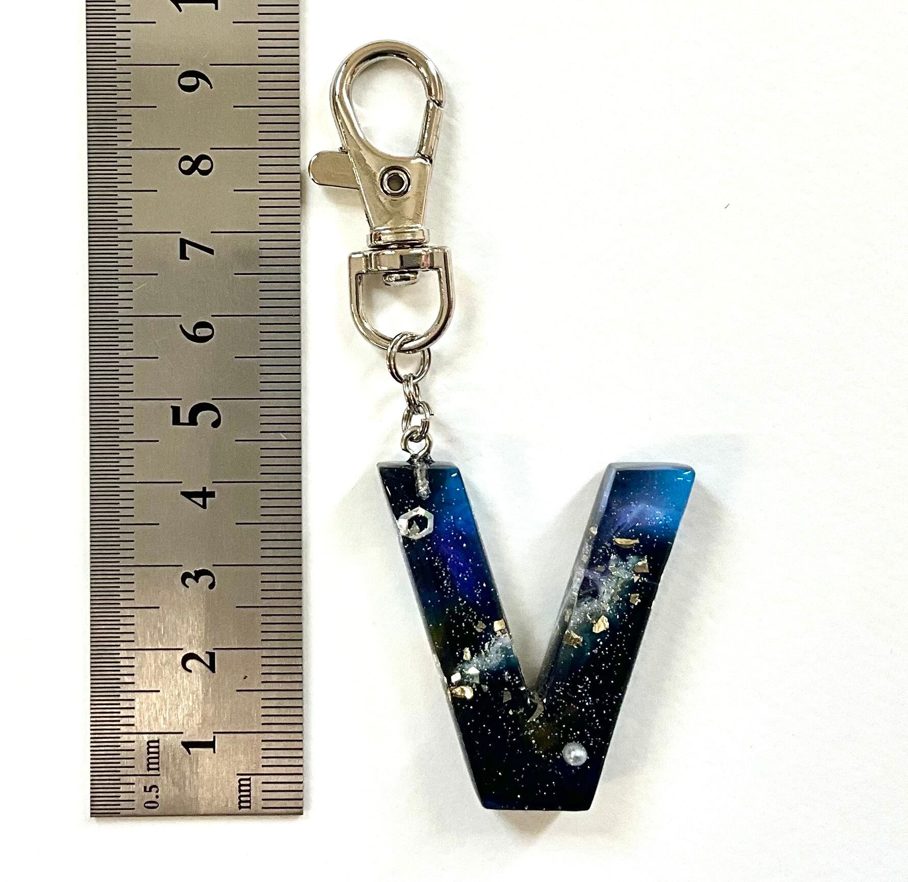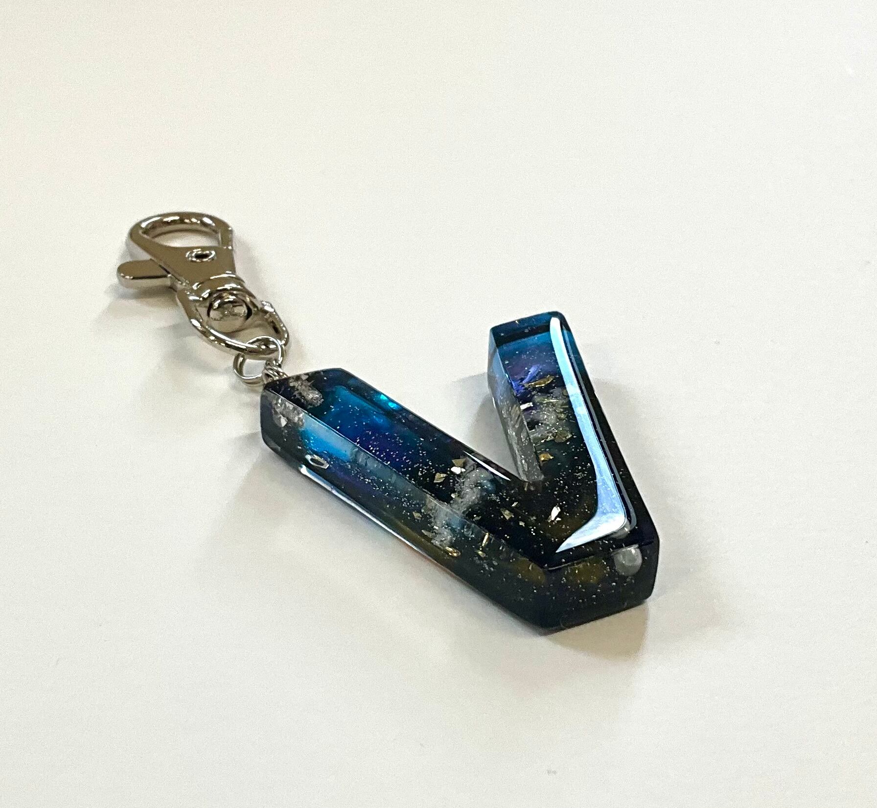 人気のアルファベットVのキーホルダーです。レジンを使用して作成されており、透明感が美しい仕上がりとなっています。