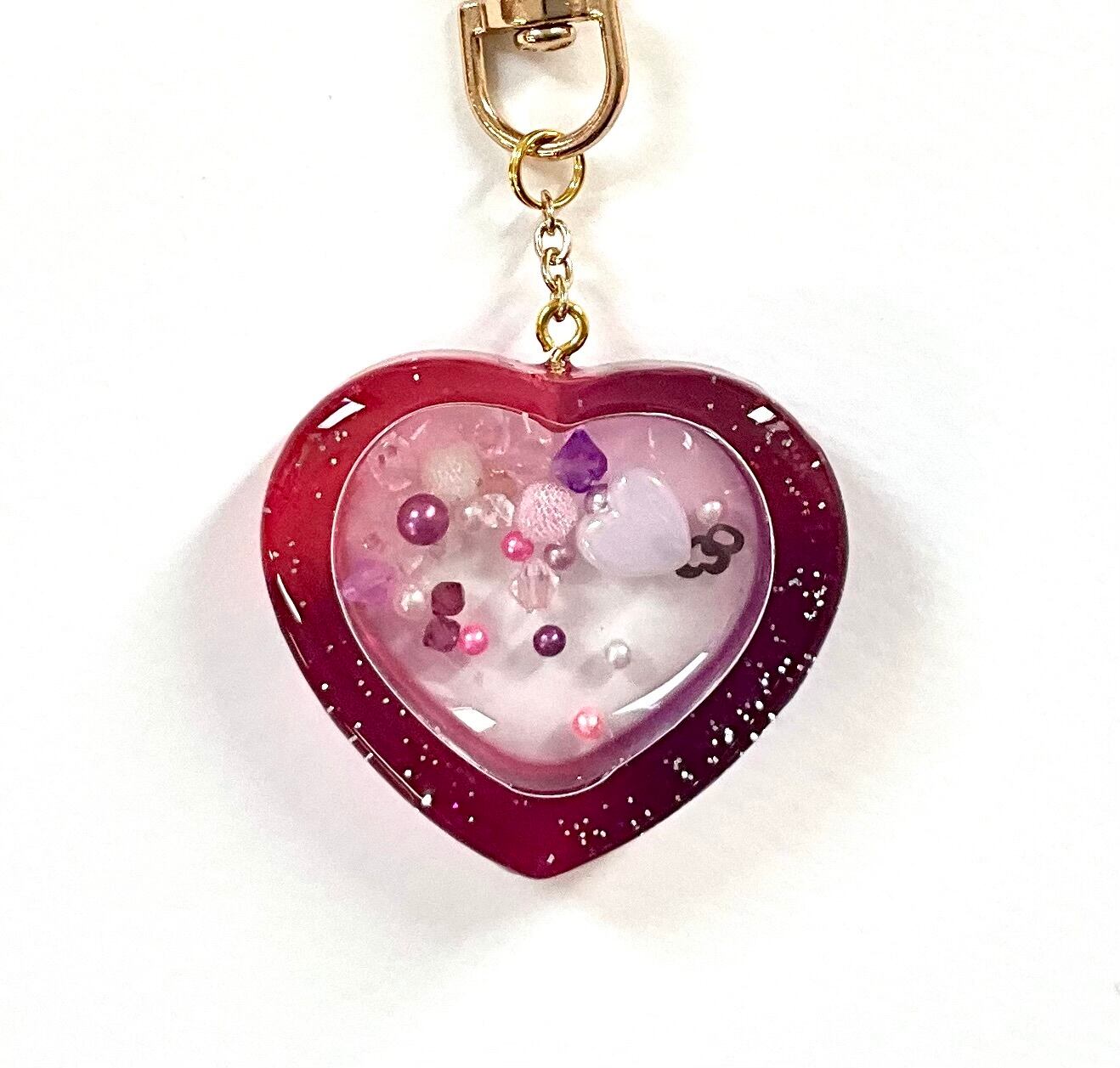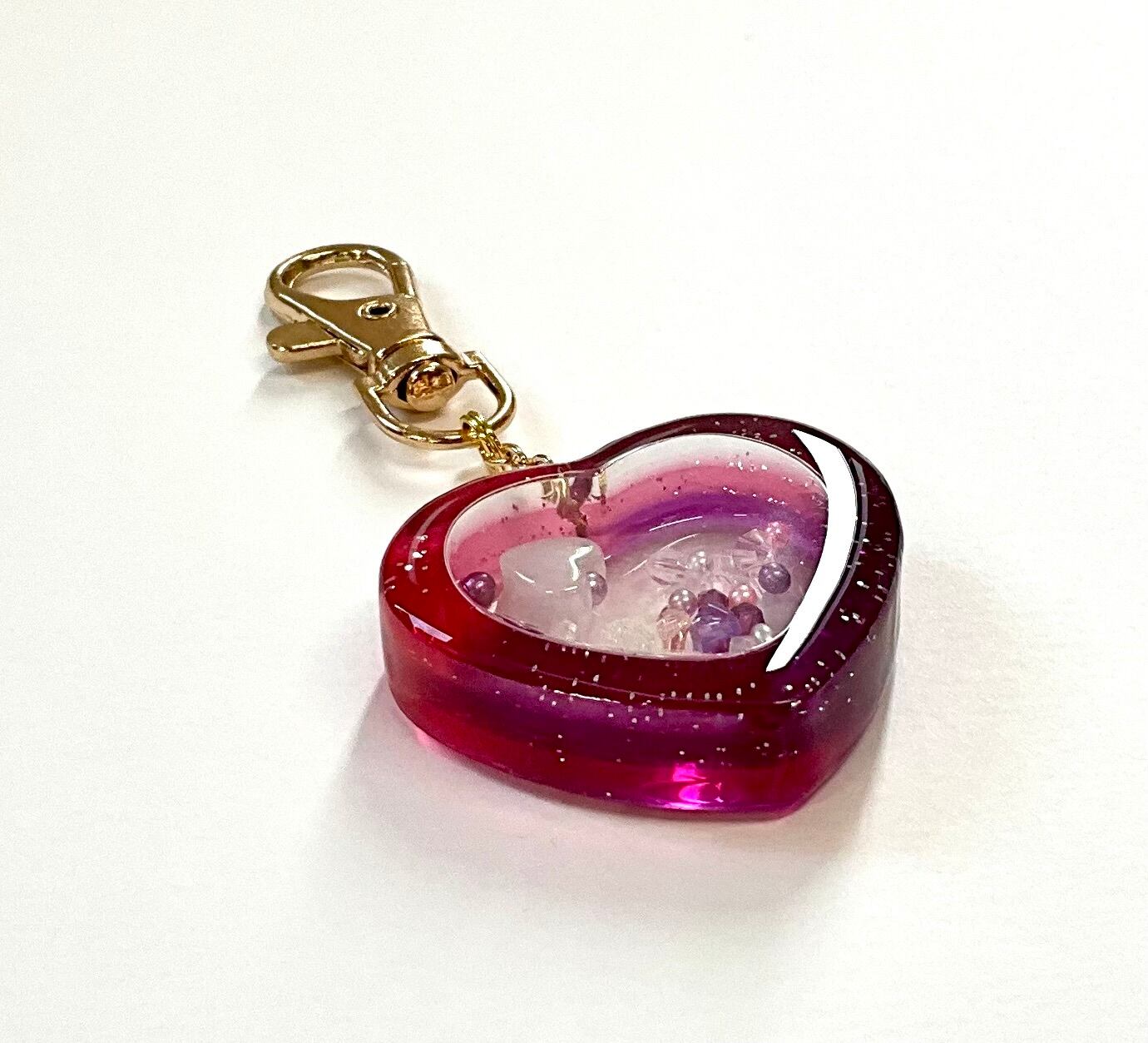 人気のハートのキーホルダーです。レジンを使用して作成されており、透明感が美しい仕上がりとなっています。