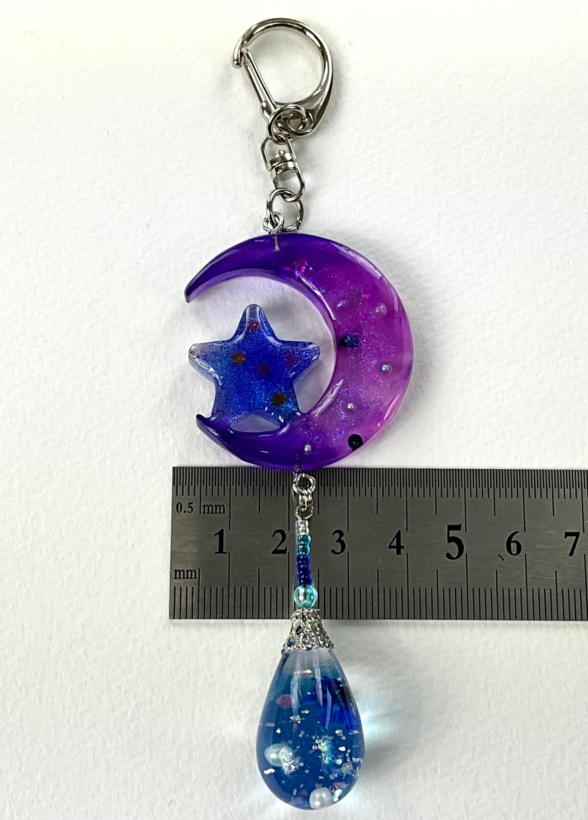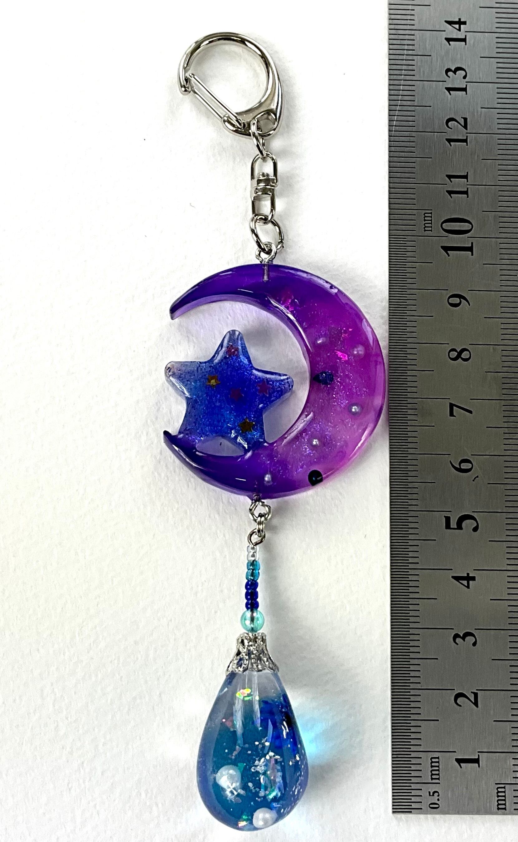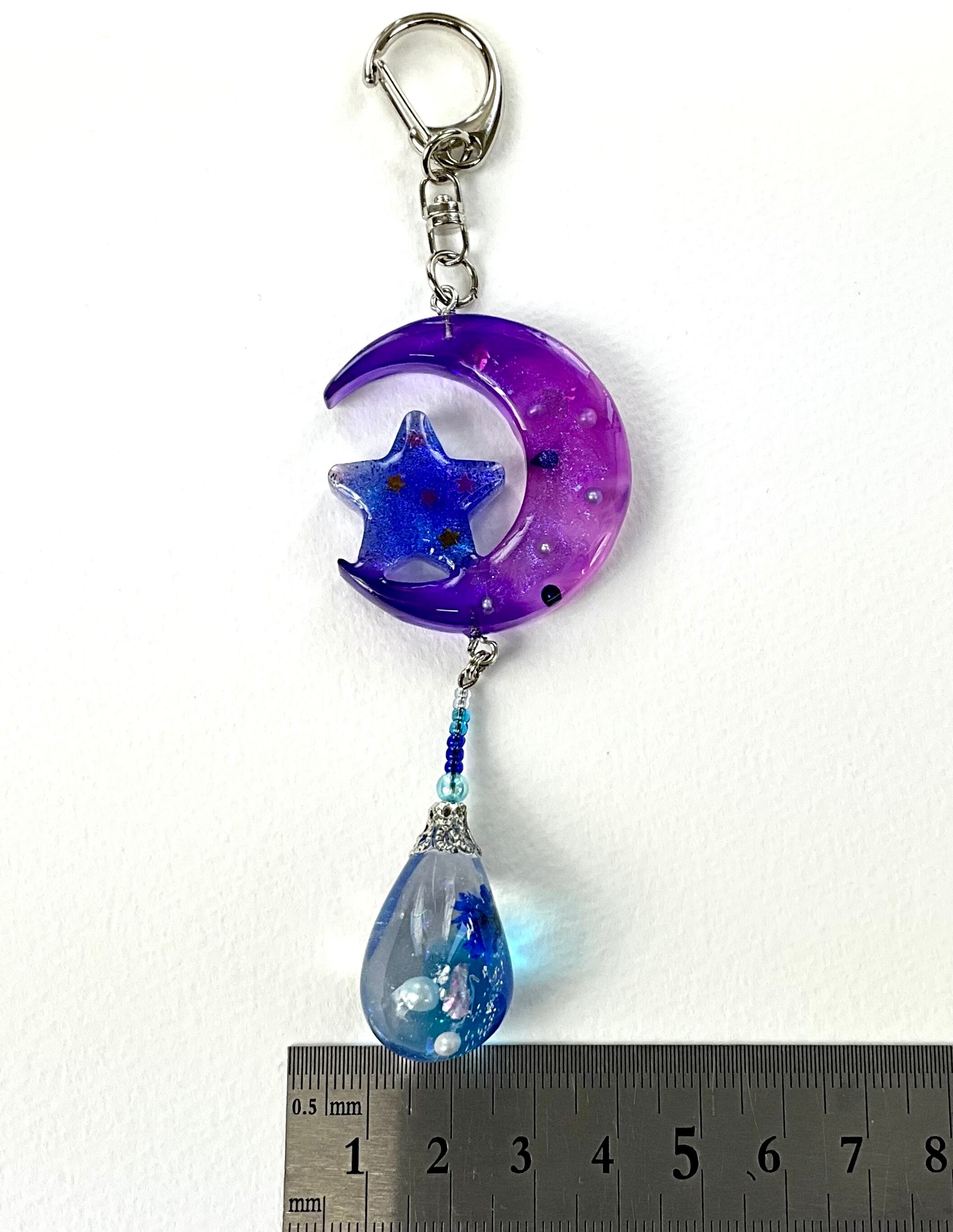 人気の月のキーホルダーです。レジンを使用して作成されており、透明感が美しい仕上がりとなっています。