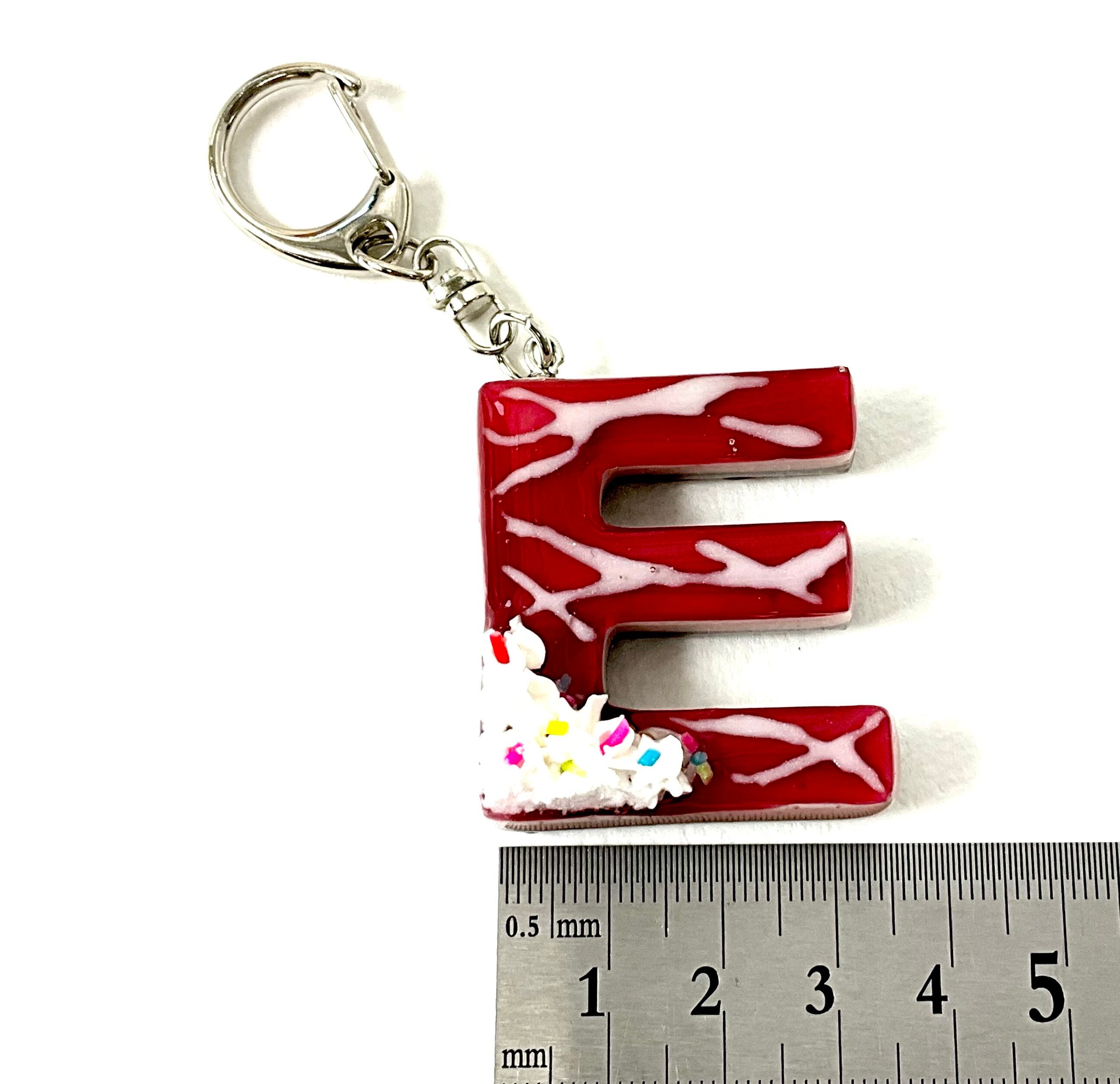 人気のアルファベットEのキーホルダーです。レジンを使用して作成されており、透明感が美しい仕上がりとなっています。