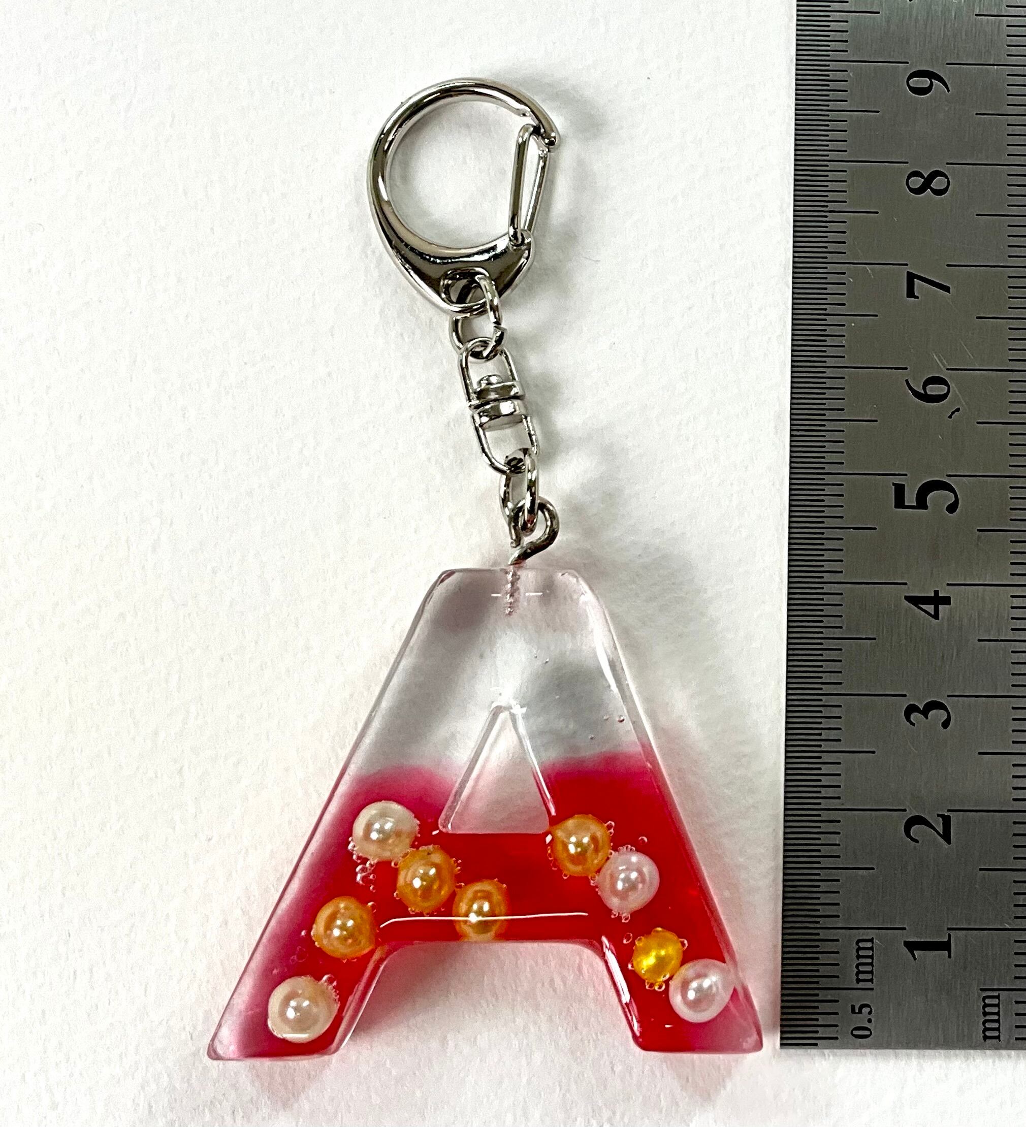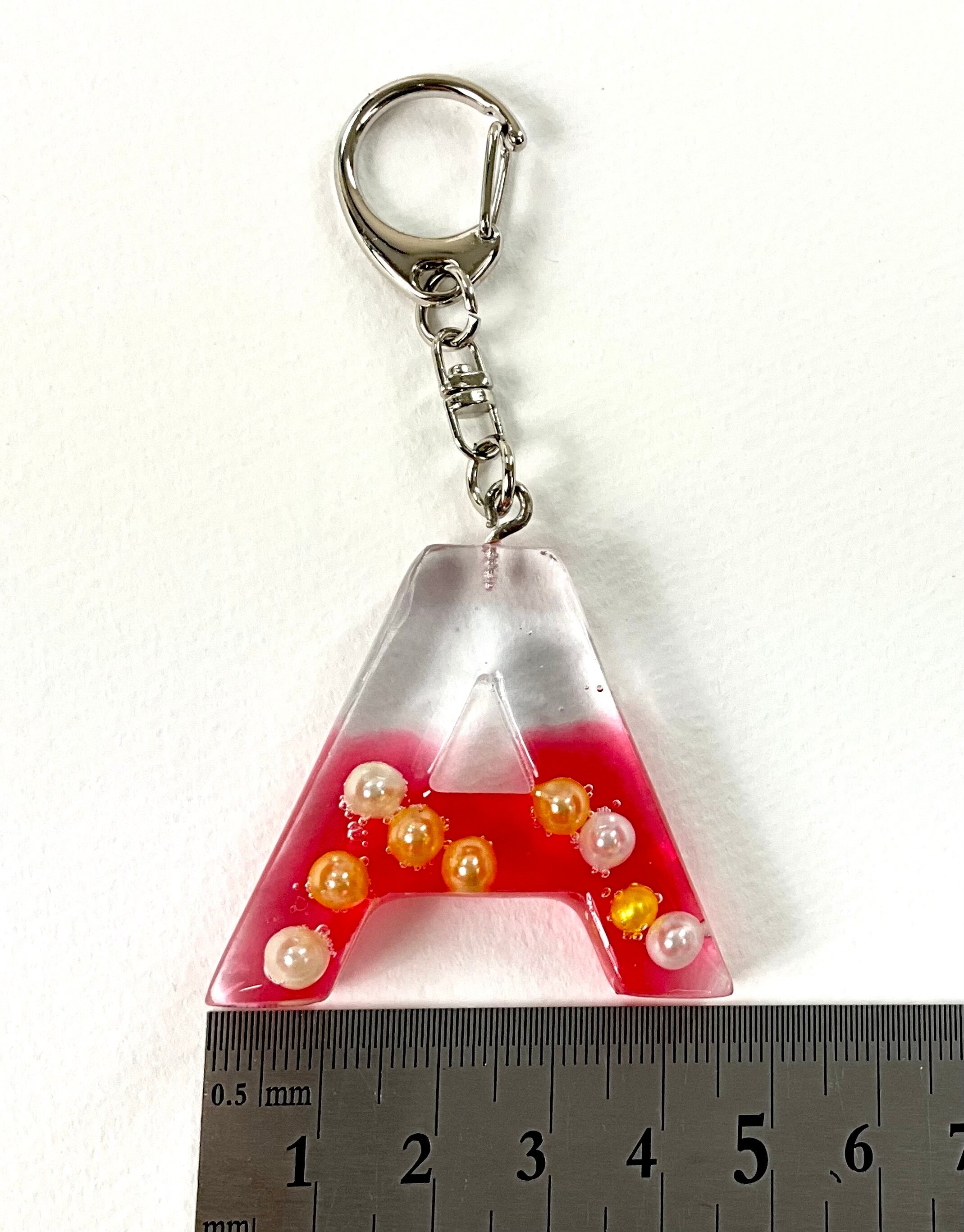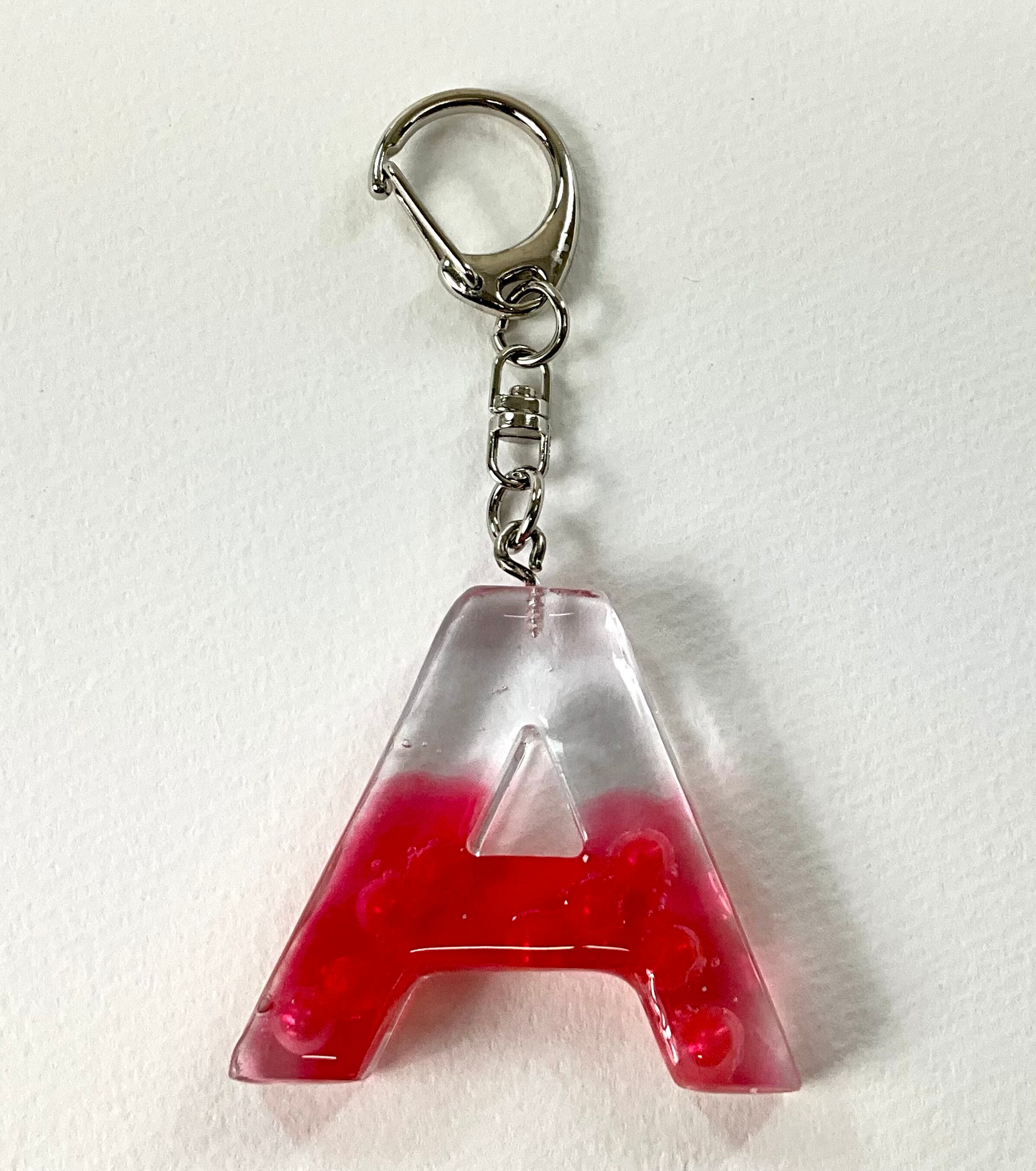 人気のアルファベットAのキーホルダーです。レジンを使用して作成されており、透明感が美しい仕上がりとなっています。