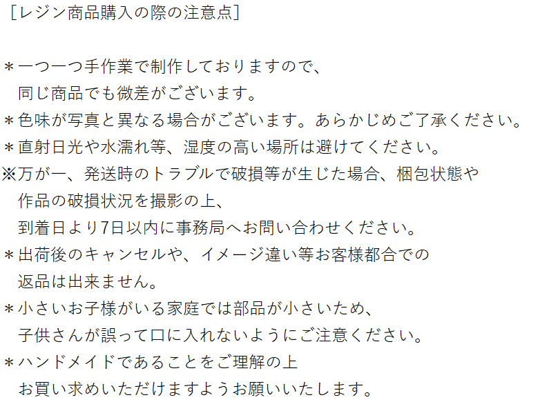 〇レジン液を使用して制作しおります。開封時、レジン特有の匂いがする事がございますが、風通しの良い場所に置いておきますと匂いは軽減されます。