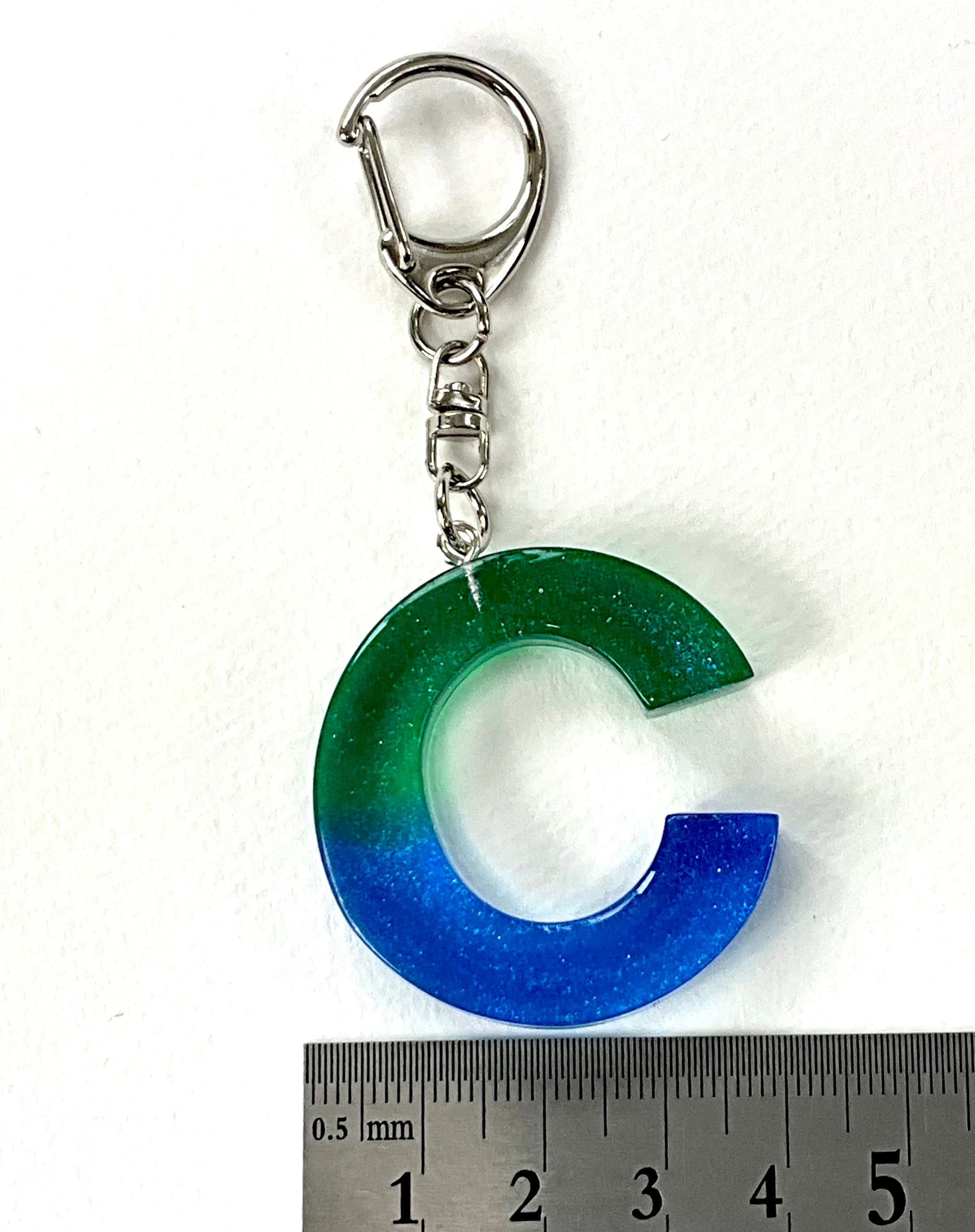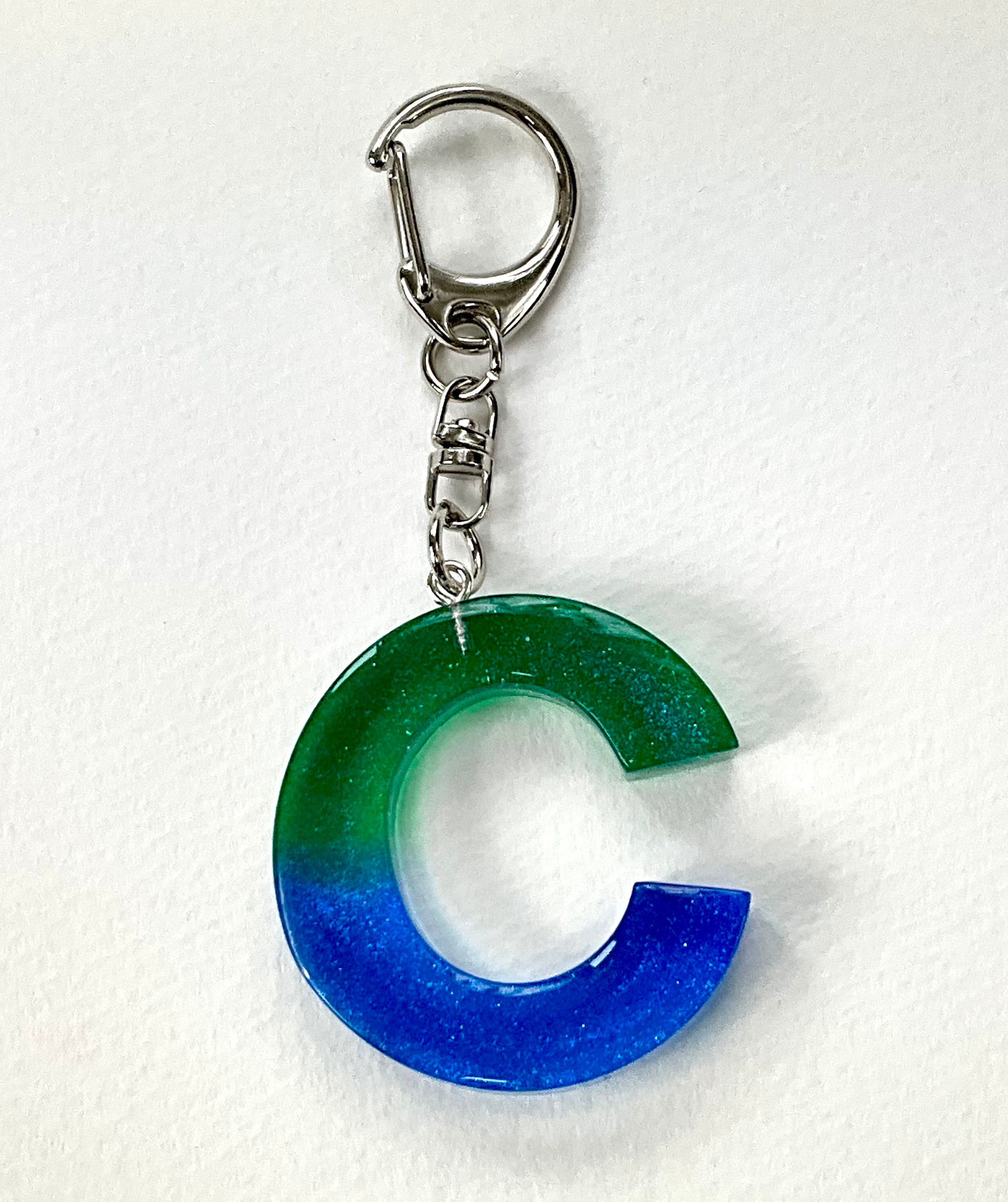 人気のアルファベットCのキーホルダーです。レジンを使用して作成されており、透明感が美しい仕上がりとなっています。