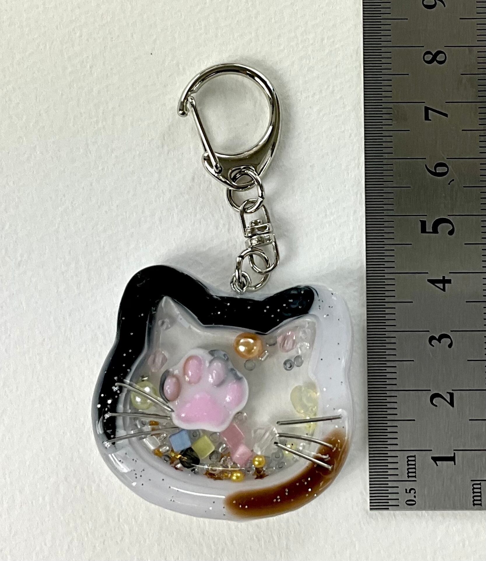 人気の猫のキーホルダーです。レジンを使用して作成されており、透明感が美しい仕上がりとなっています。
