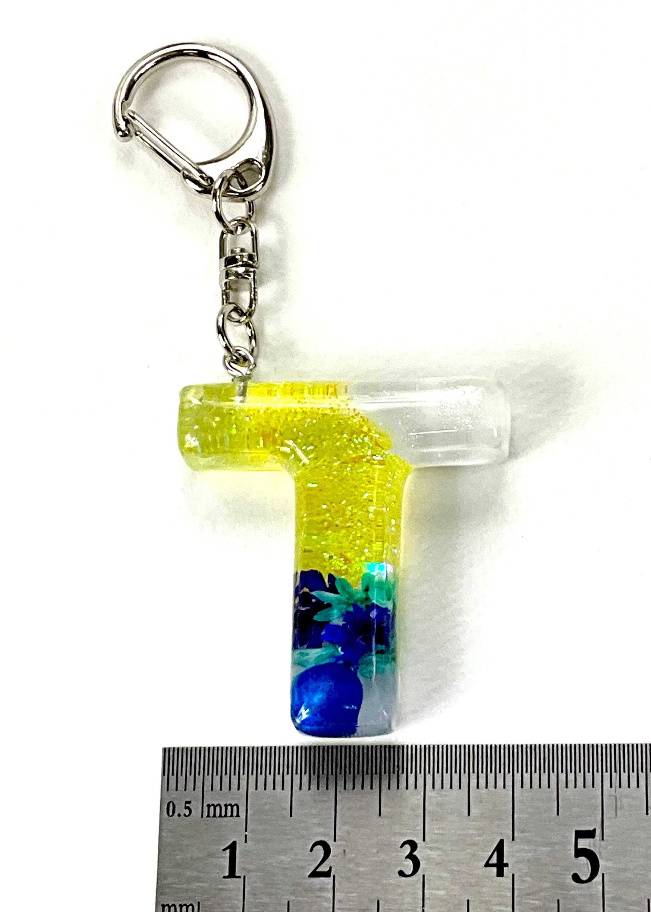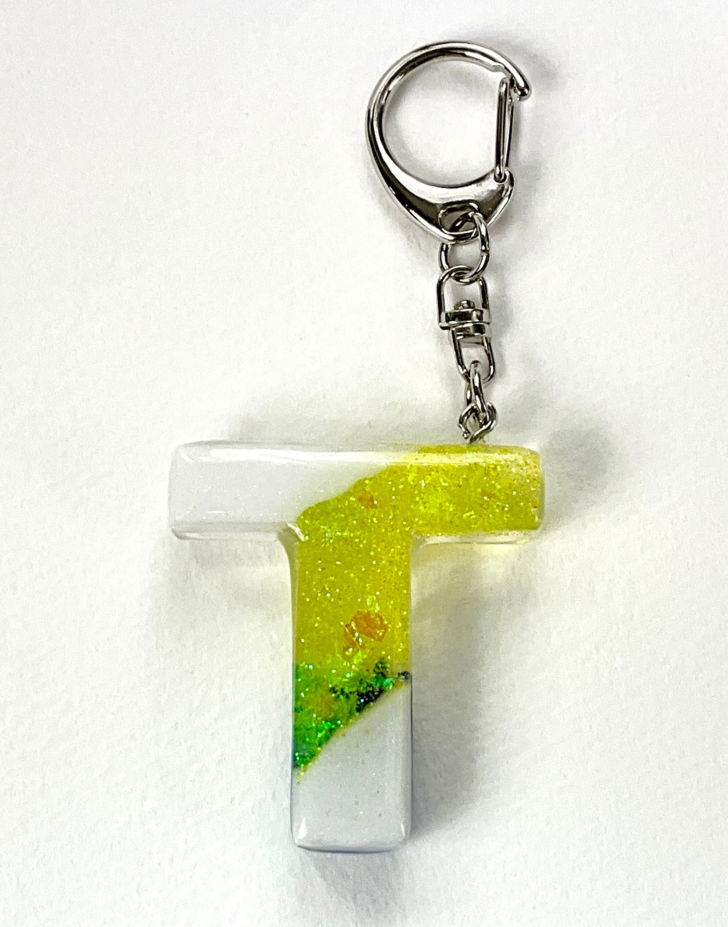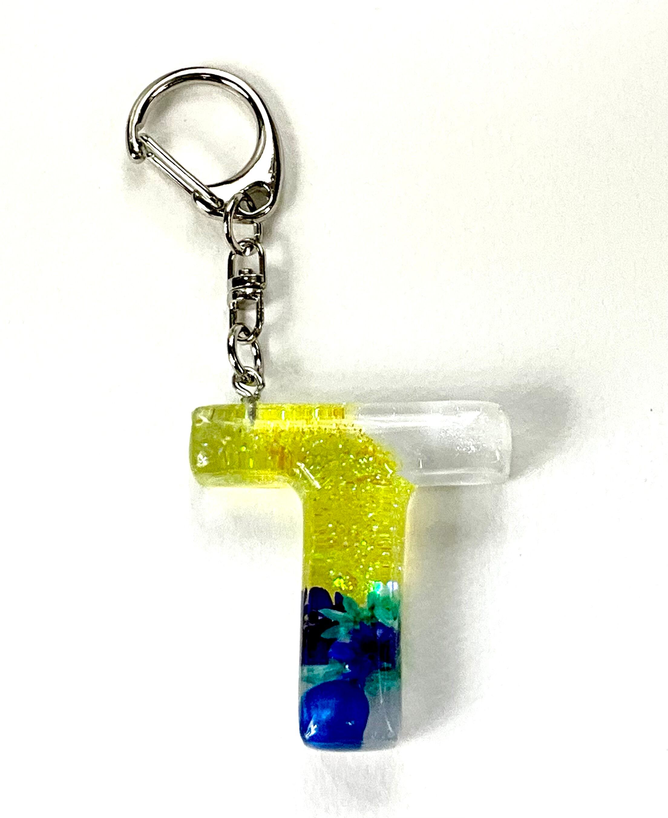 人気のアルファベットTのキーホルダーです。レジンを使用して作成されており、透明感が美しい仕上がりとなっています。