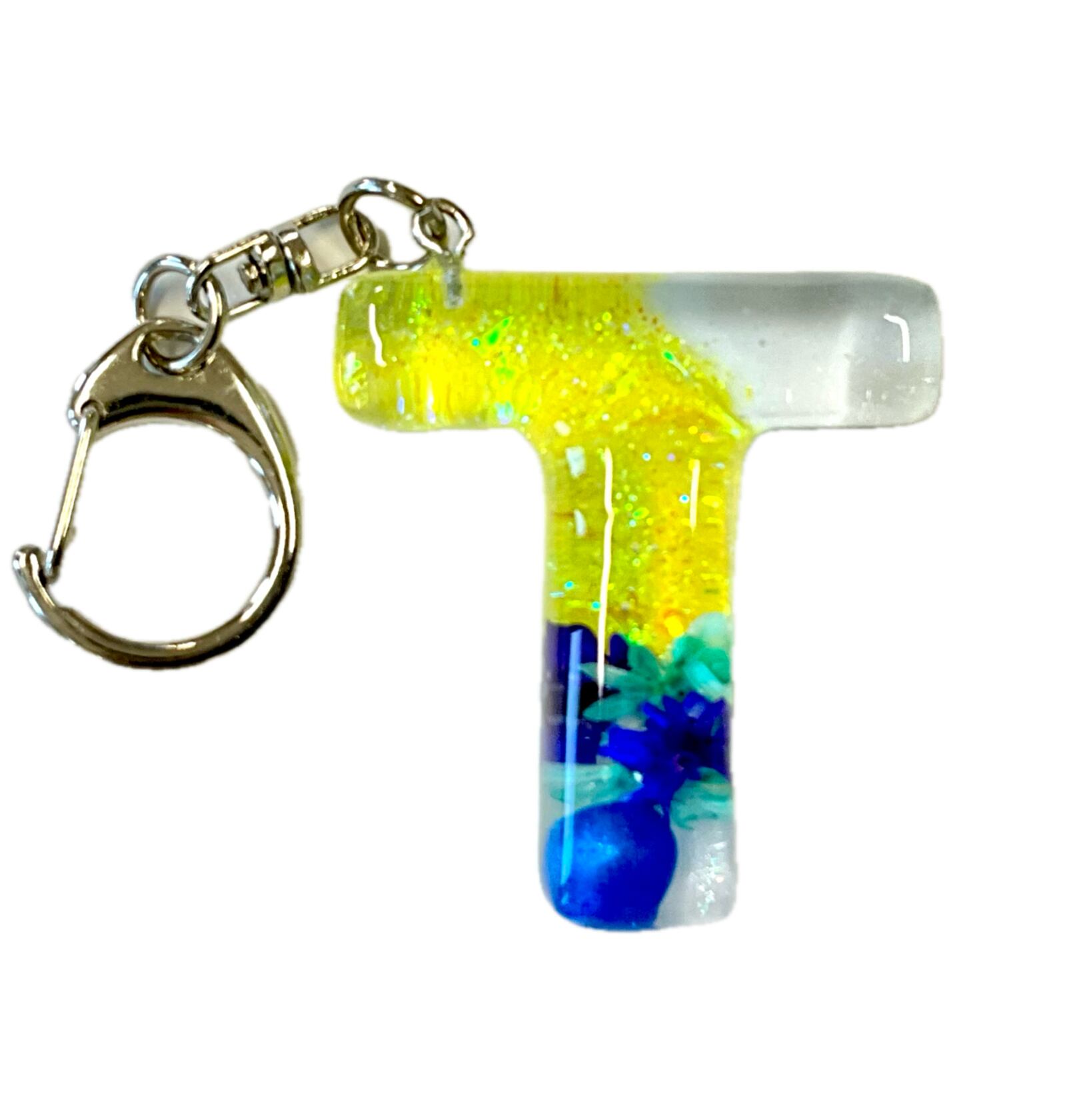 イエローとブルーの透明感があるレジンで仕上げたイニシャルキーホルダーです。