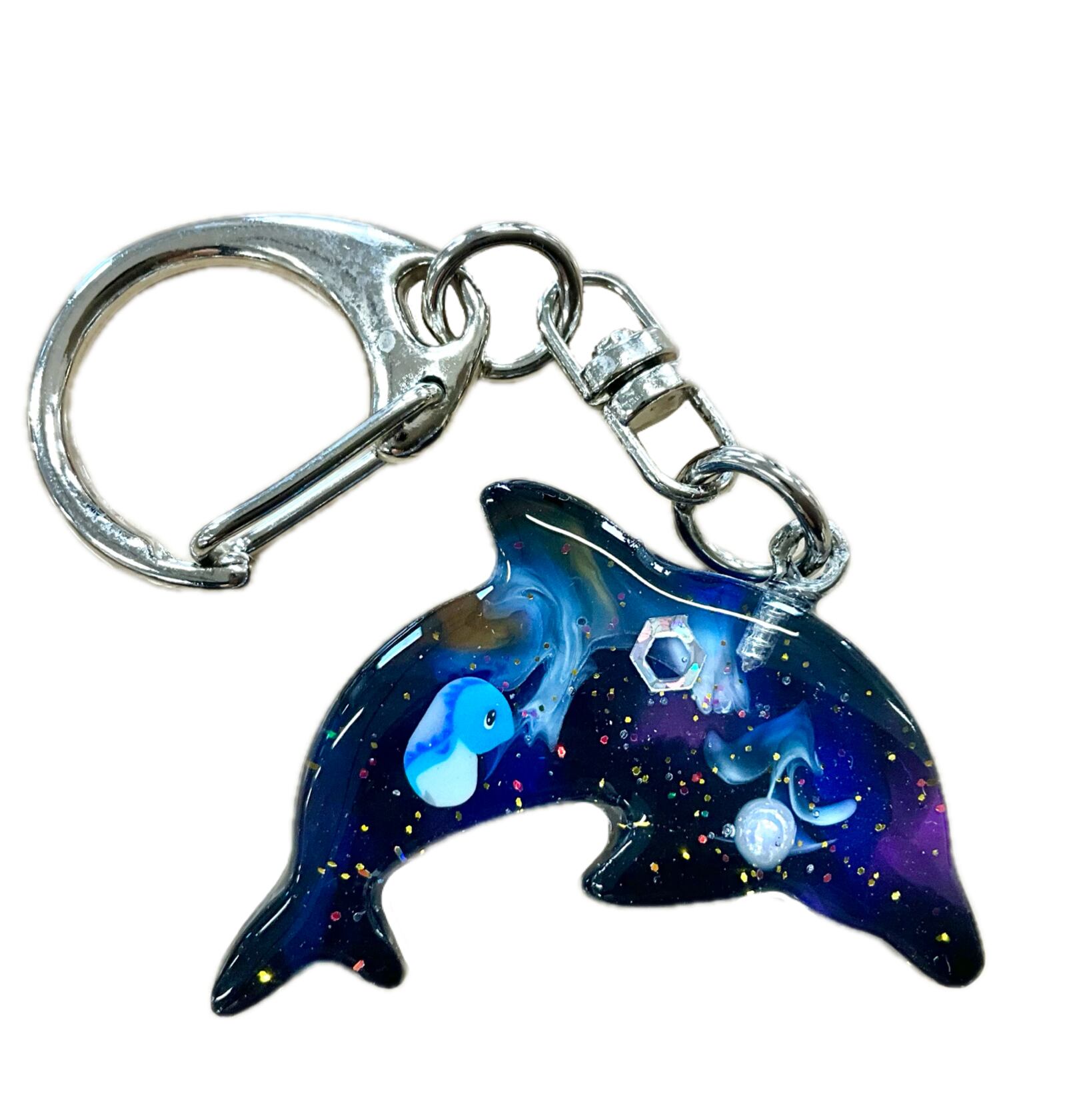 海をイメージした神秘的なイルカのレジンキーホルダーです。