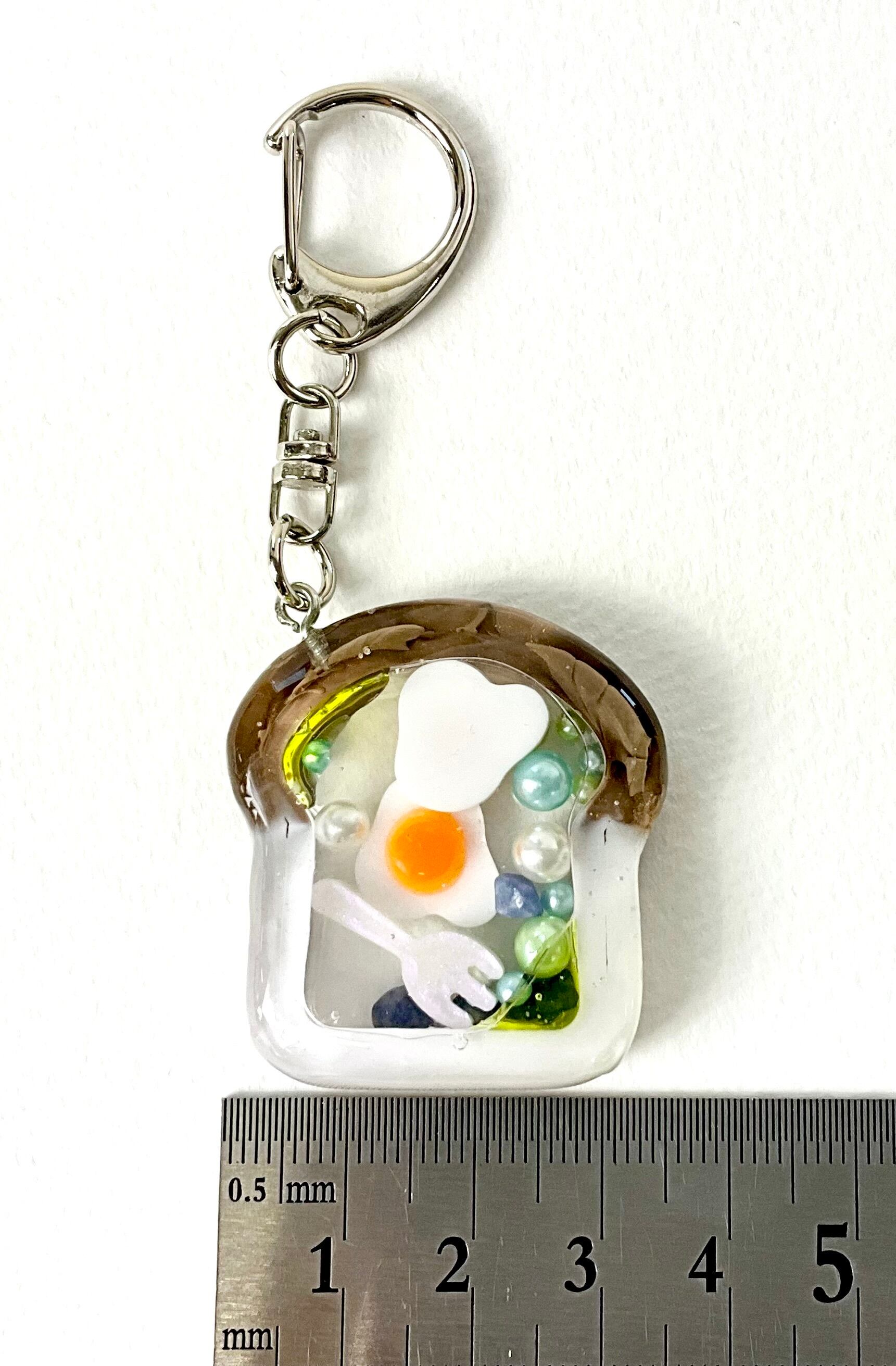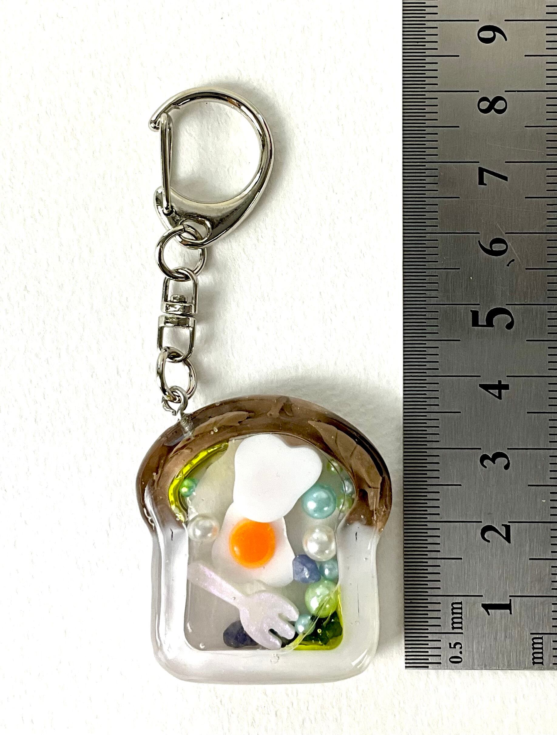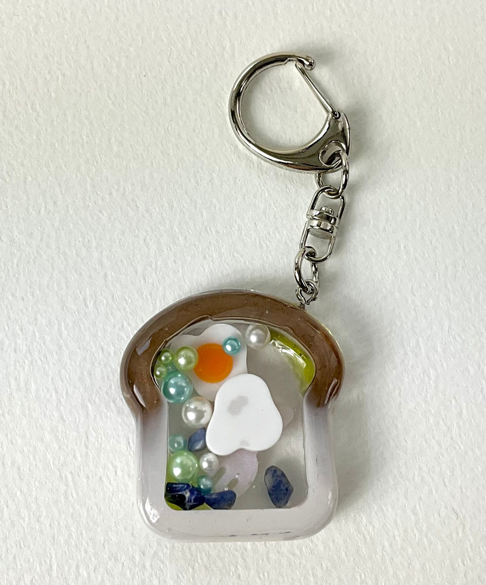 食べ物のキーホルダーです。レジンを使用して作成されており、透明感が美しい仕上がりとなっています。