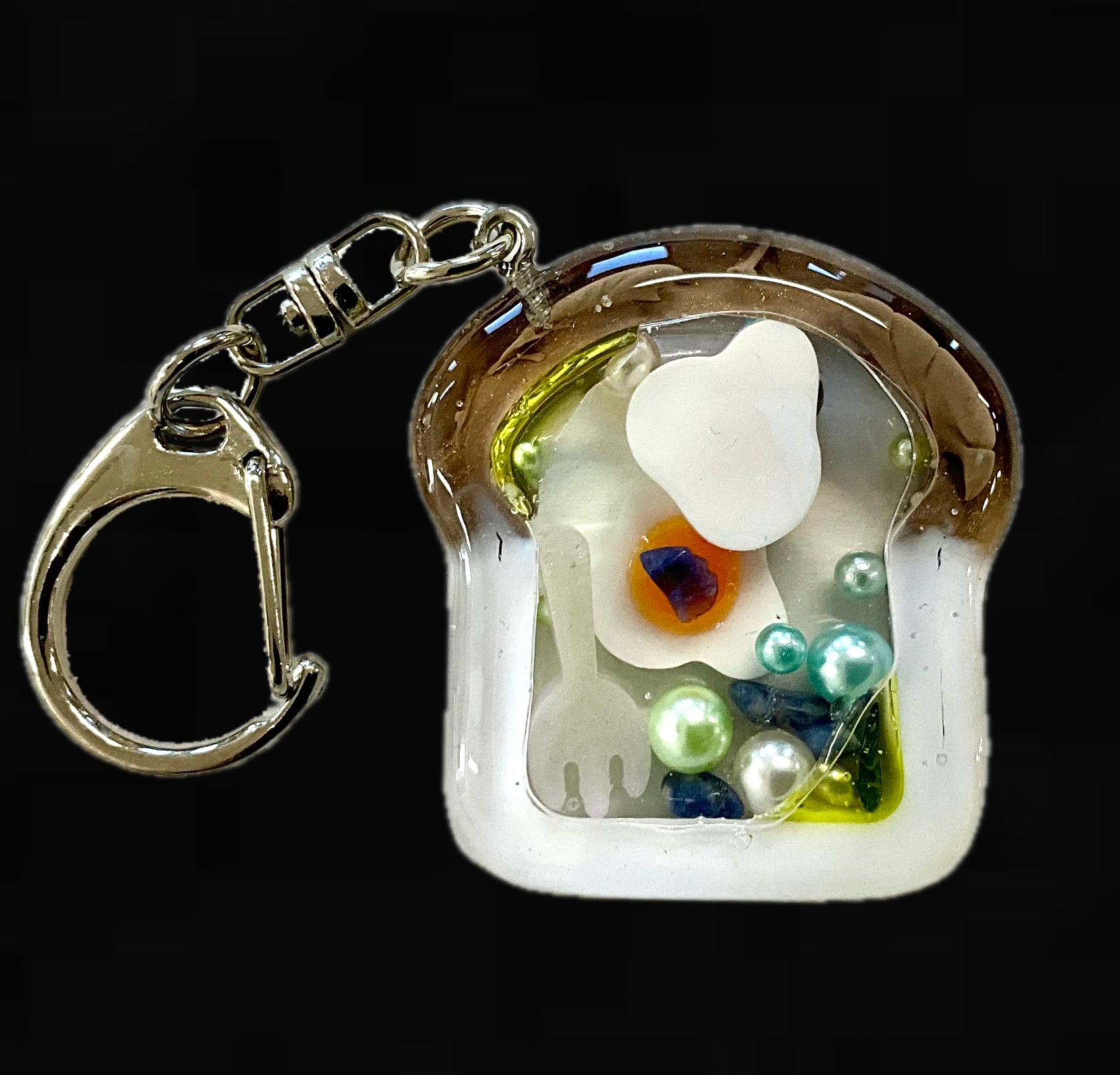 目玉焼きをパンに閉じ込めたレジンキーホルダーです。