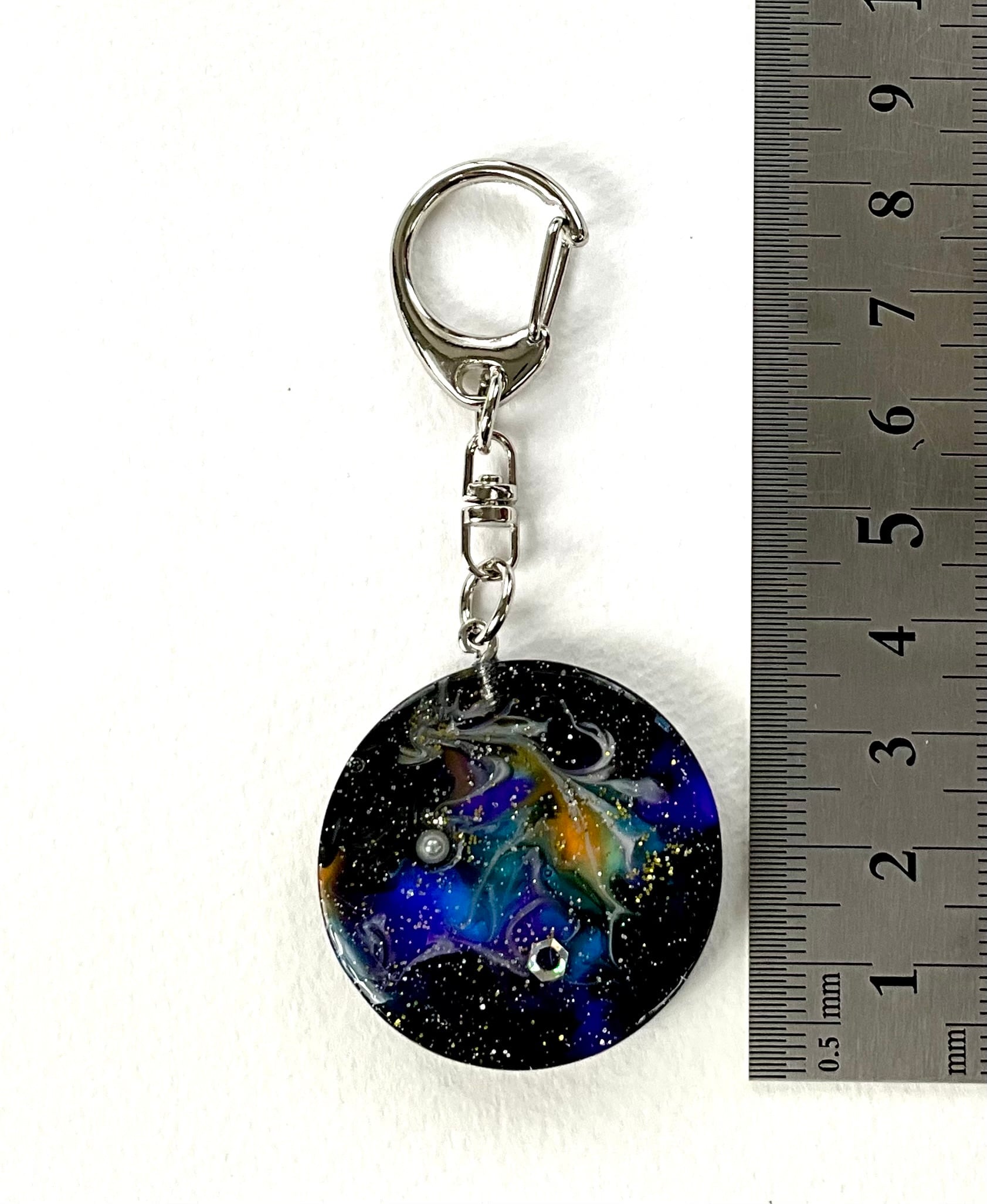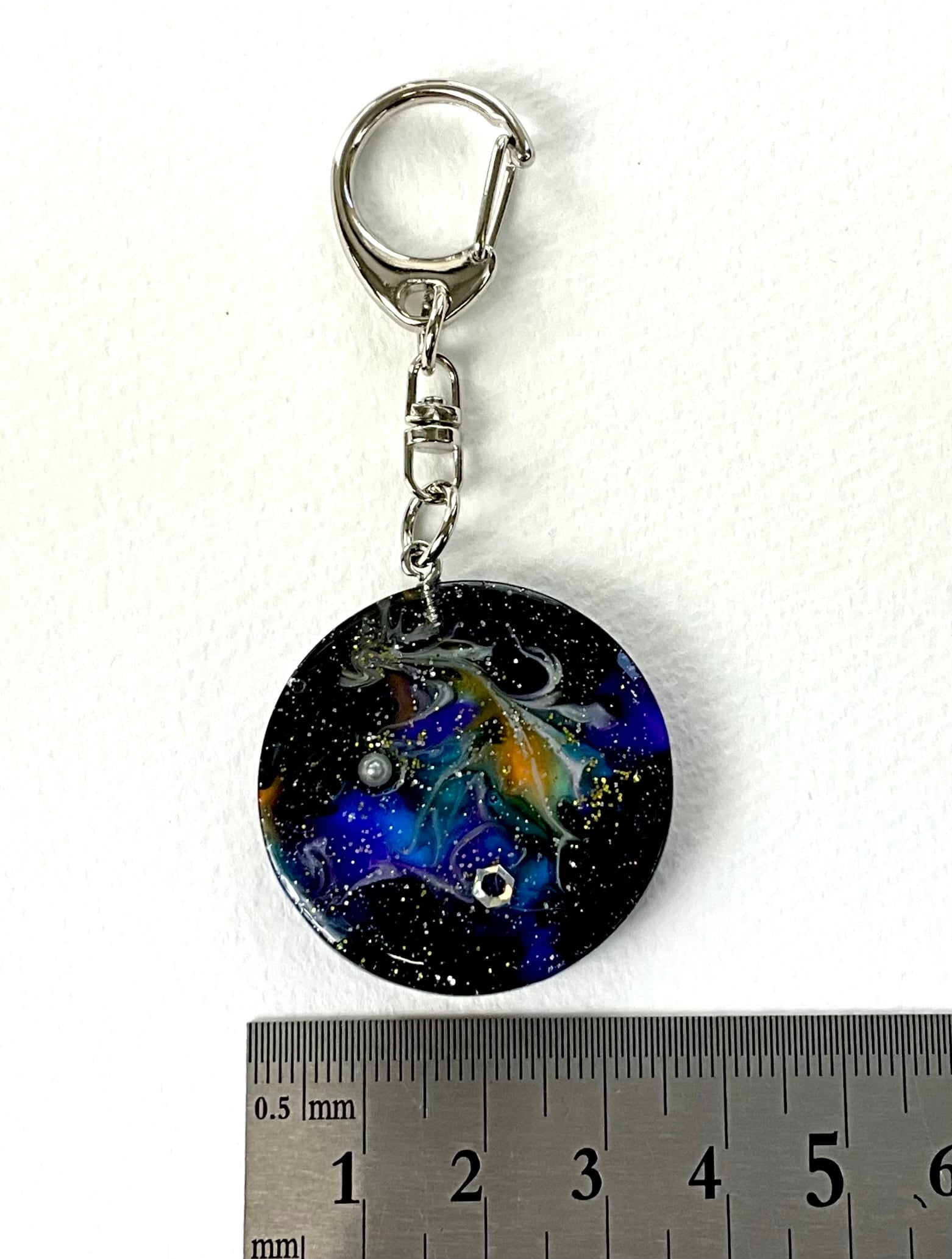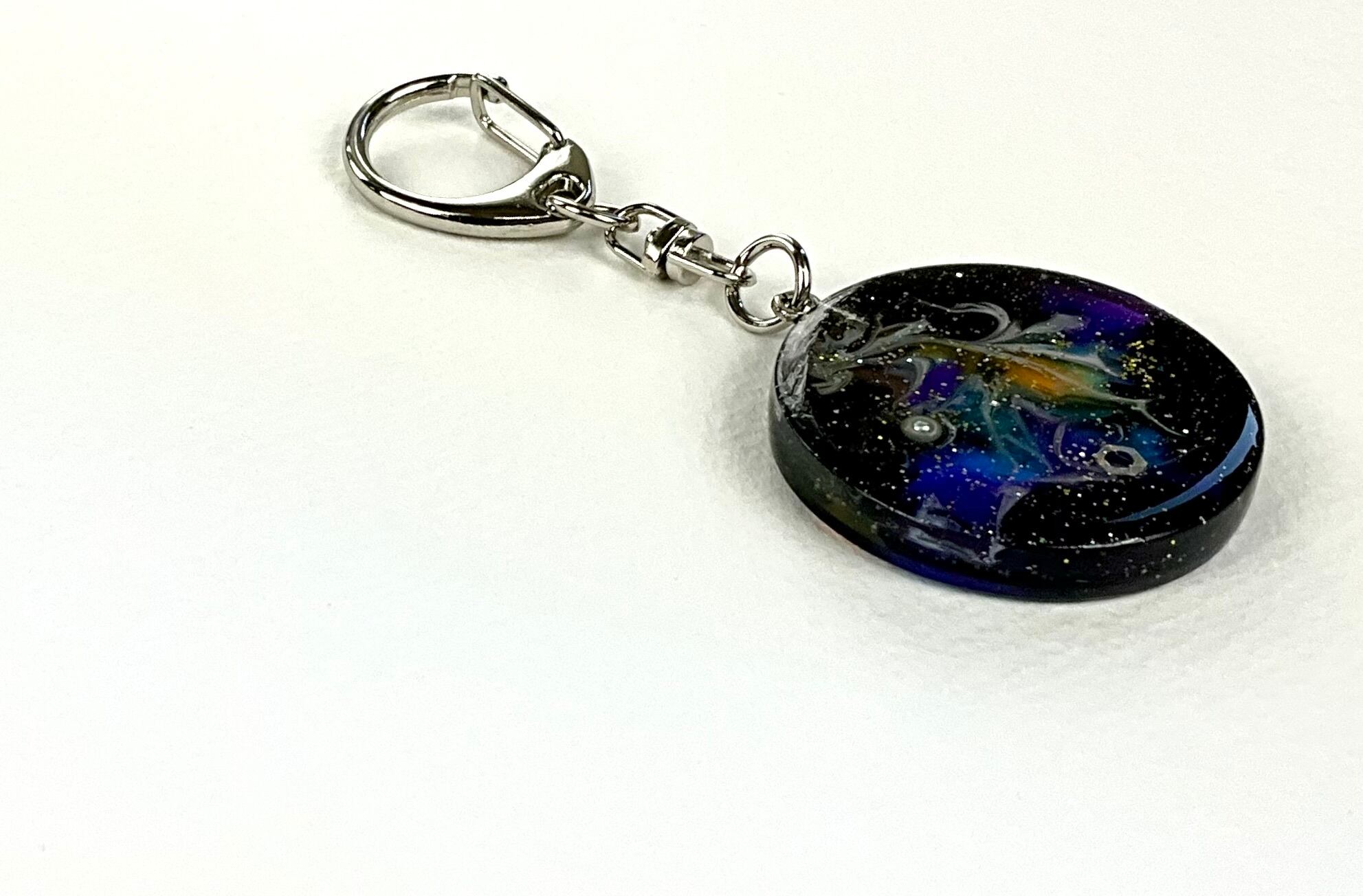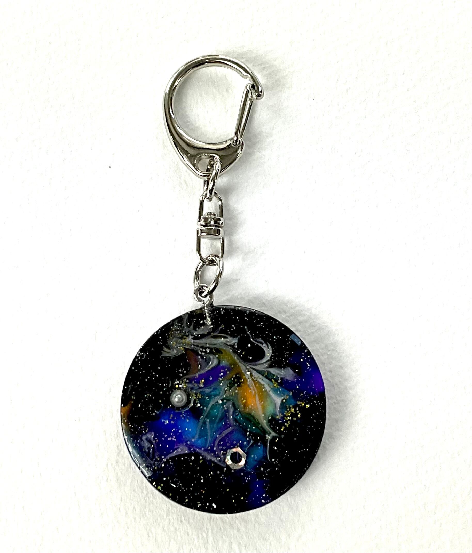 宇宙のキーホルダーです。レジンを使用して作成されており、透明感が美しい仕上がりとなっています。
