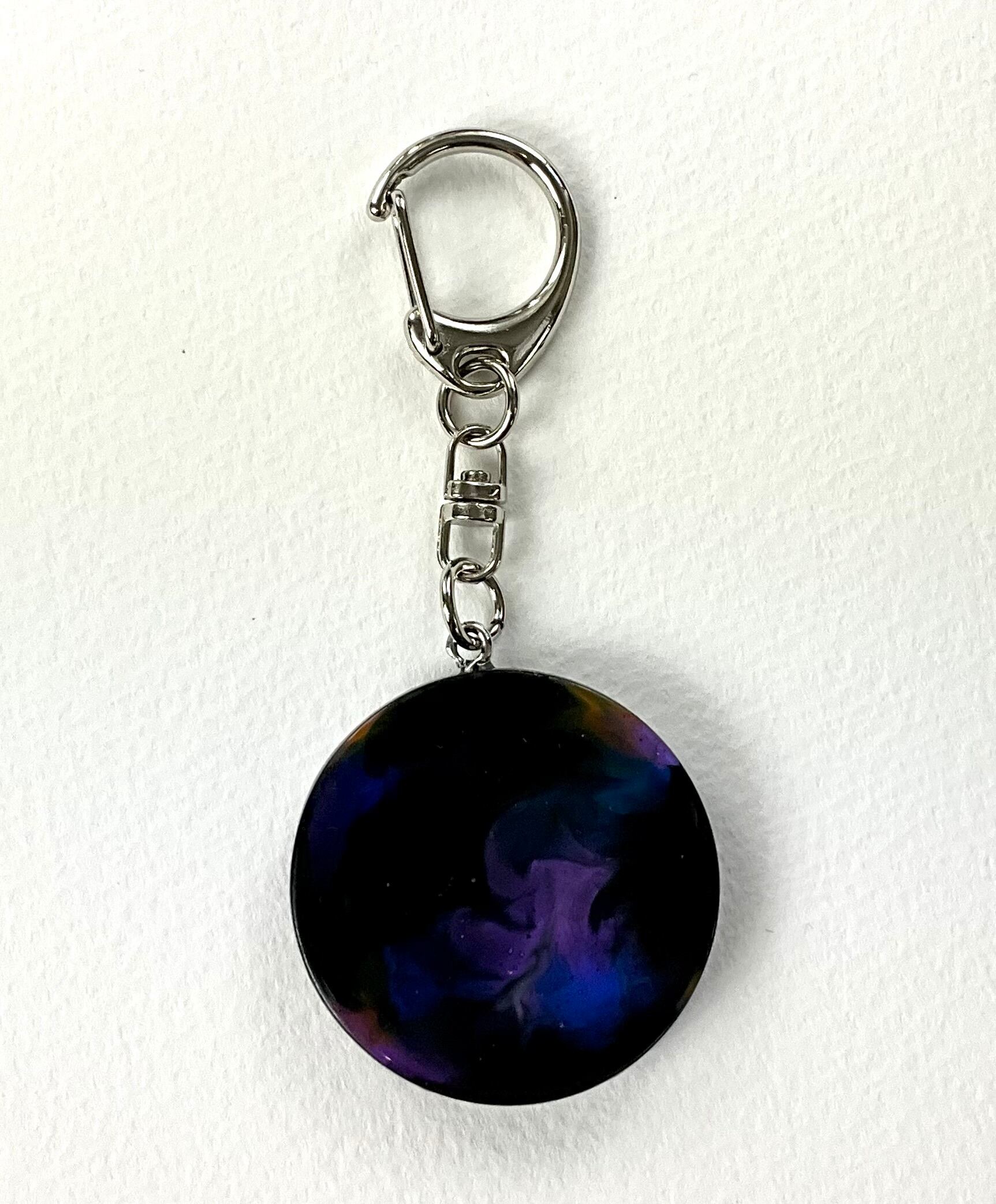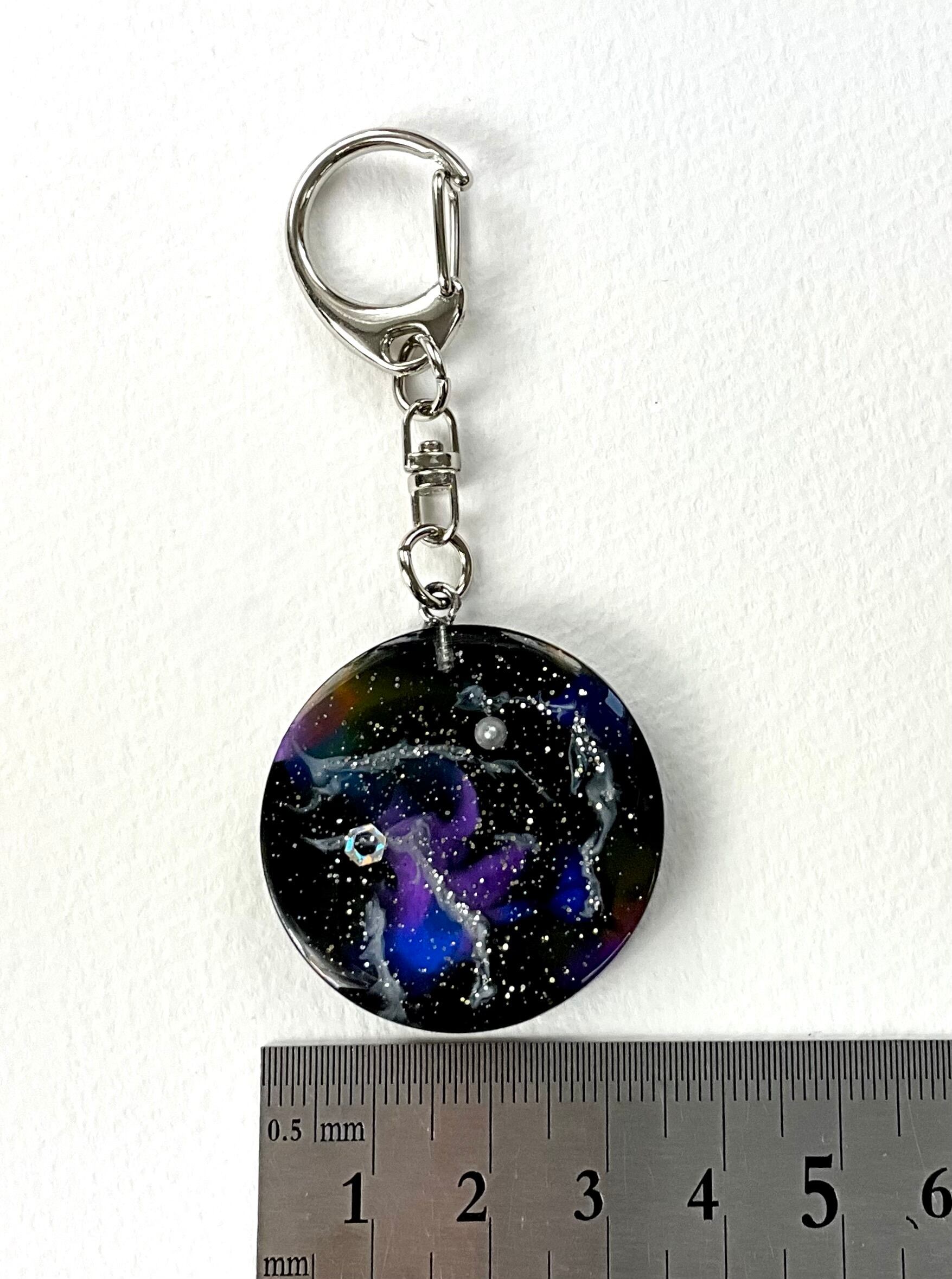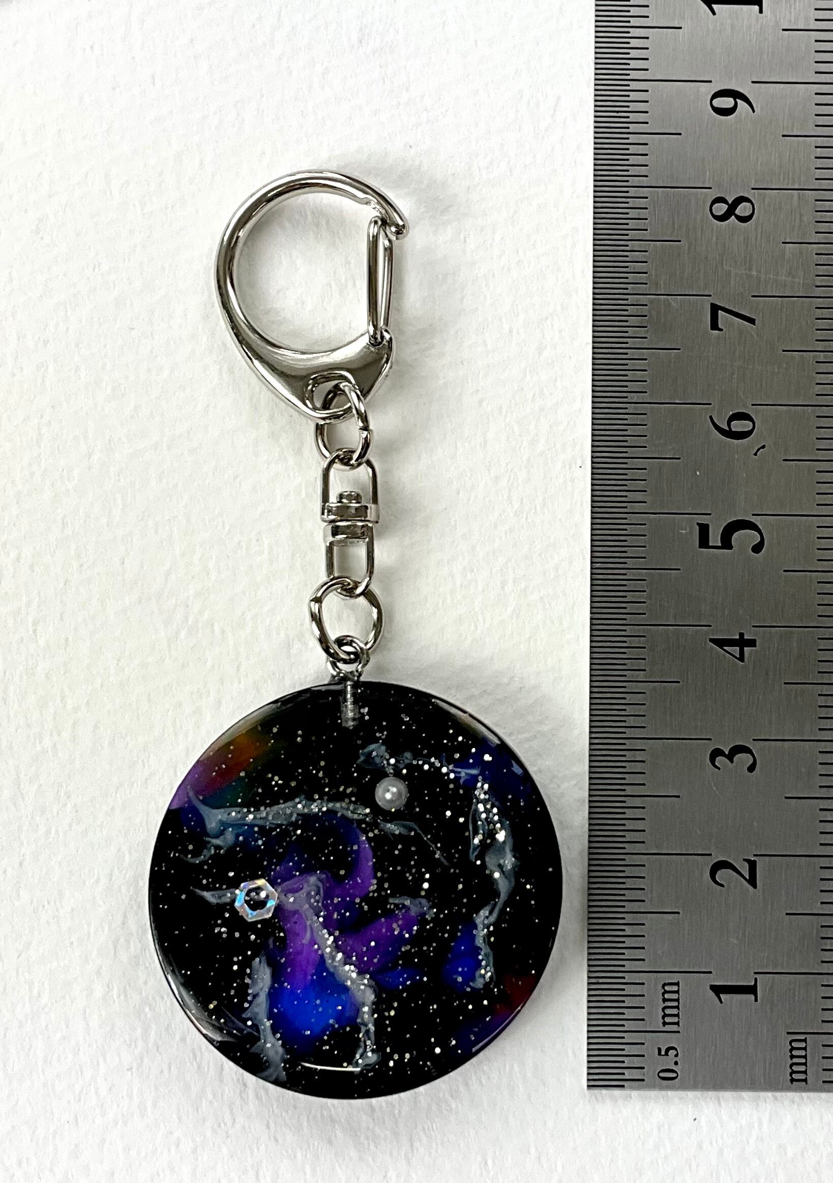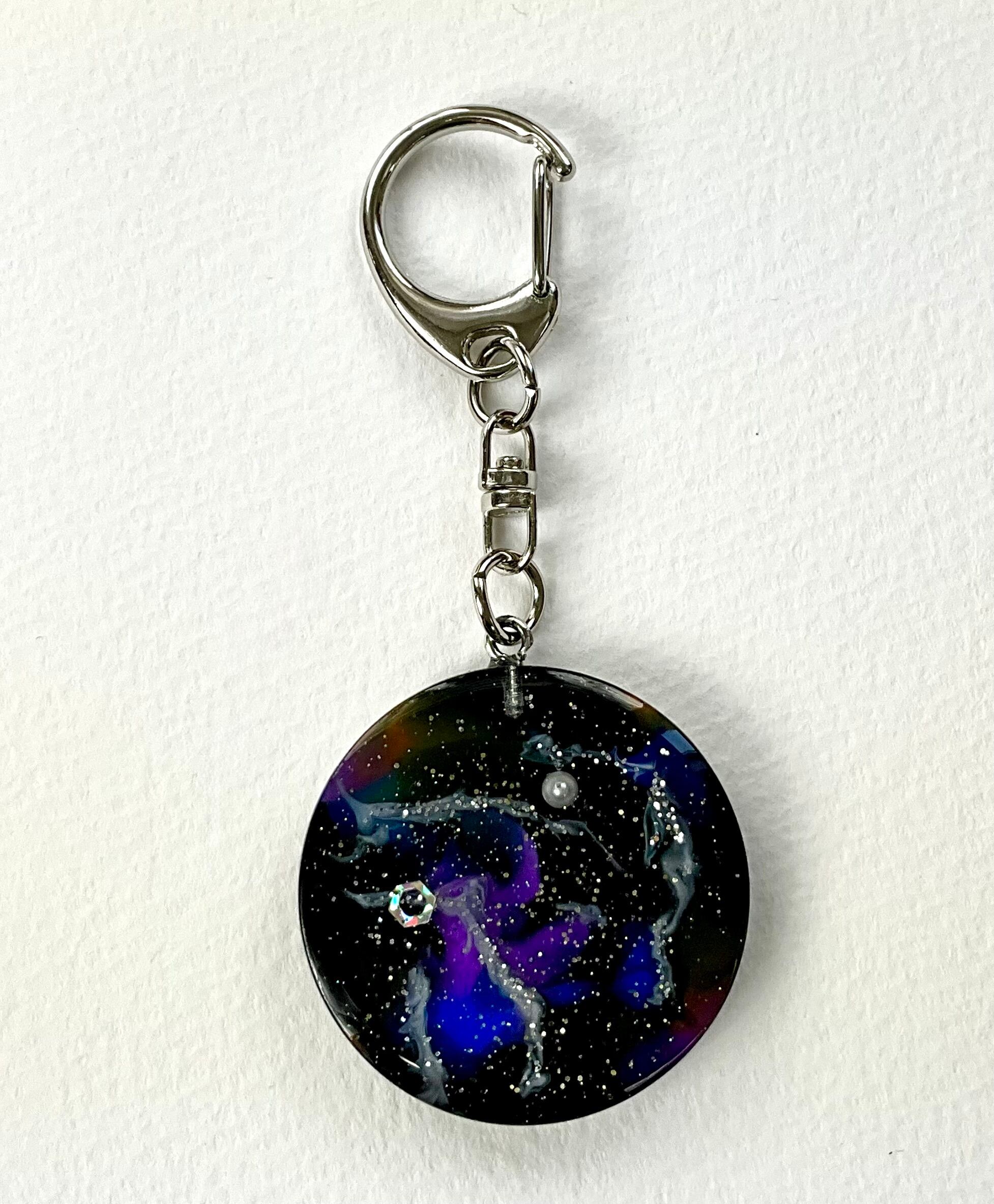 宇宙のキーホルダーです。レジンを使用して作成されており、透明感が美しい仕上がりとなっています。
