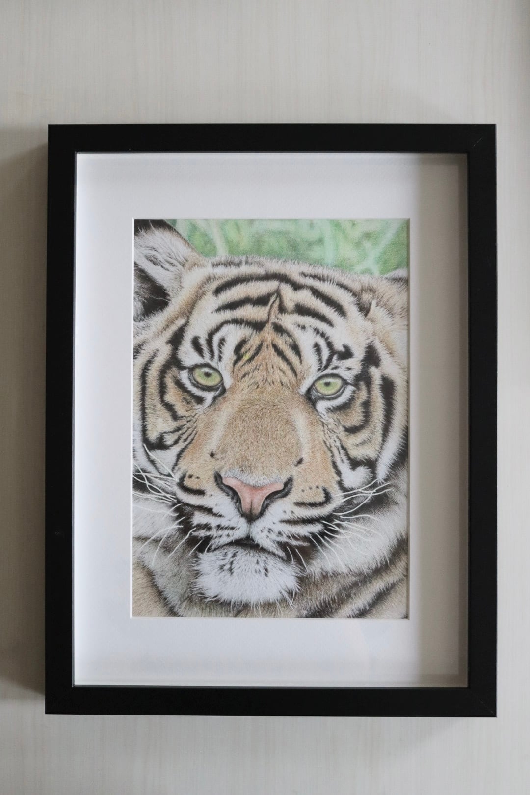 色鉛筆で描いた迫力のあるトラの絵です。
