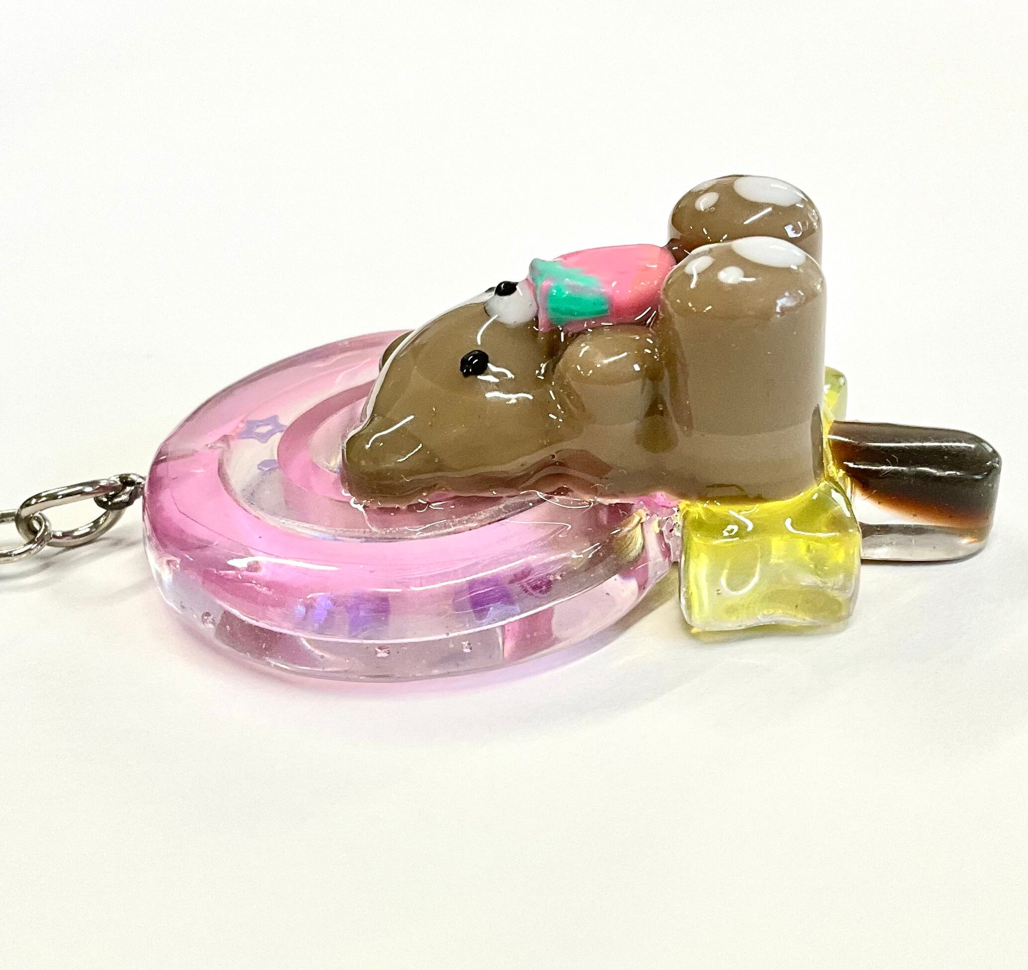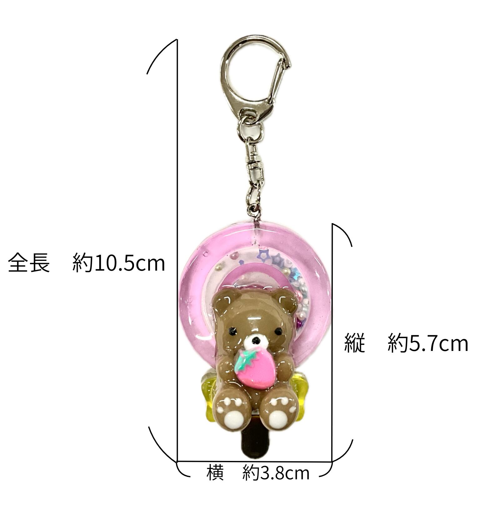 シャカシャカキャンディーにイチゴを持ったクマをドッキングさせた、可愛らしいスイーツレジンキーホルダーです。
