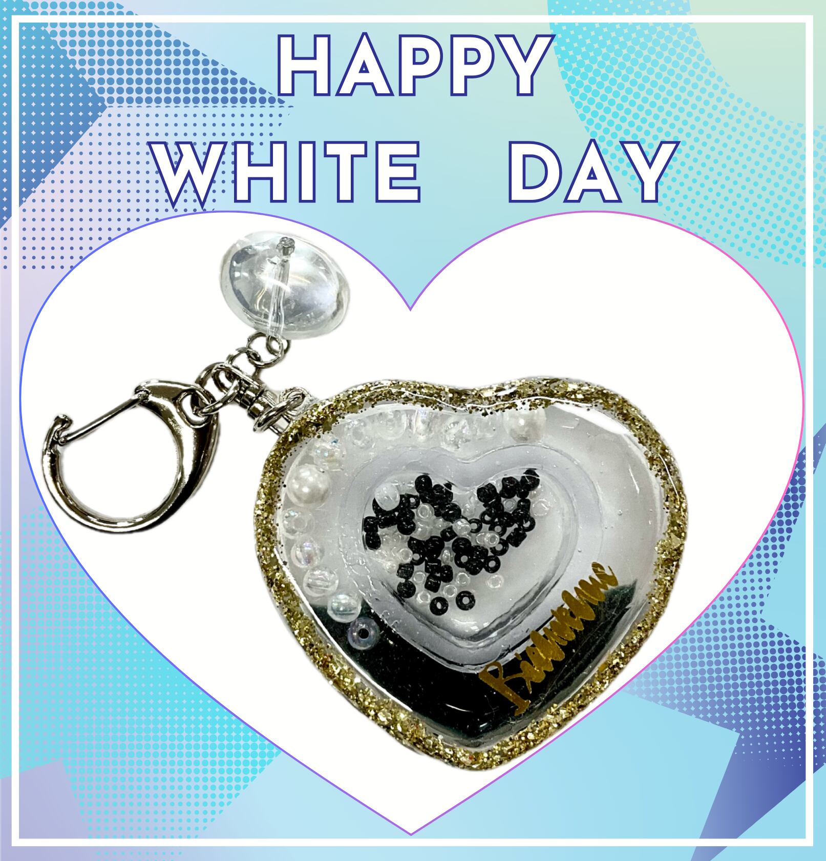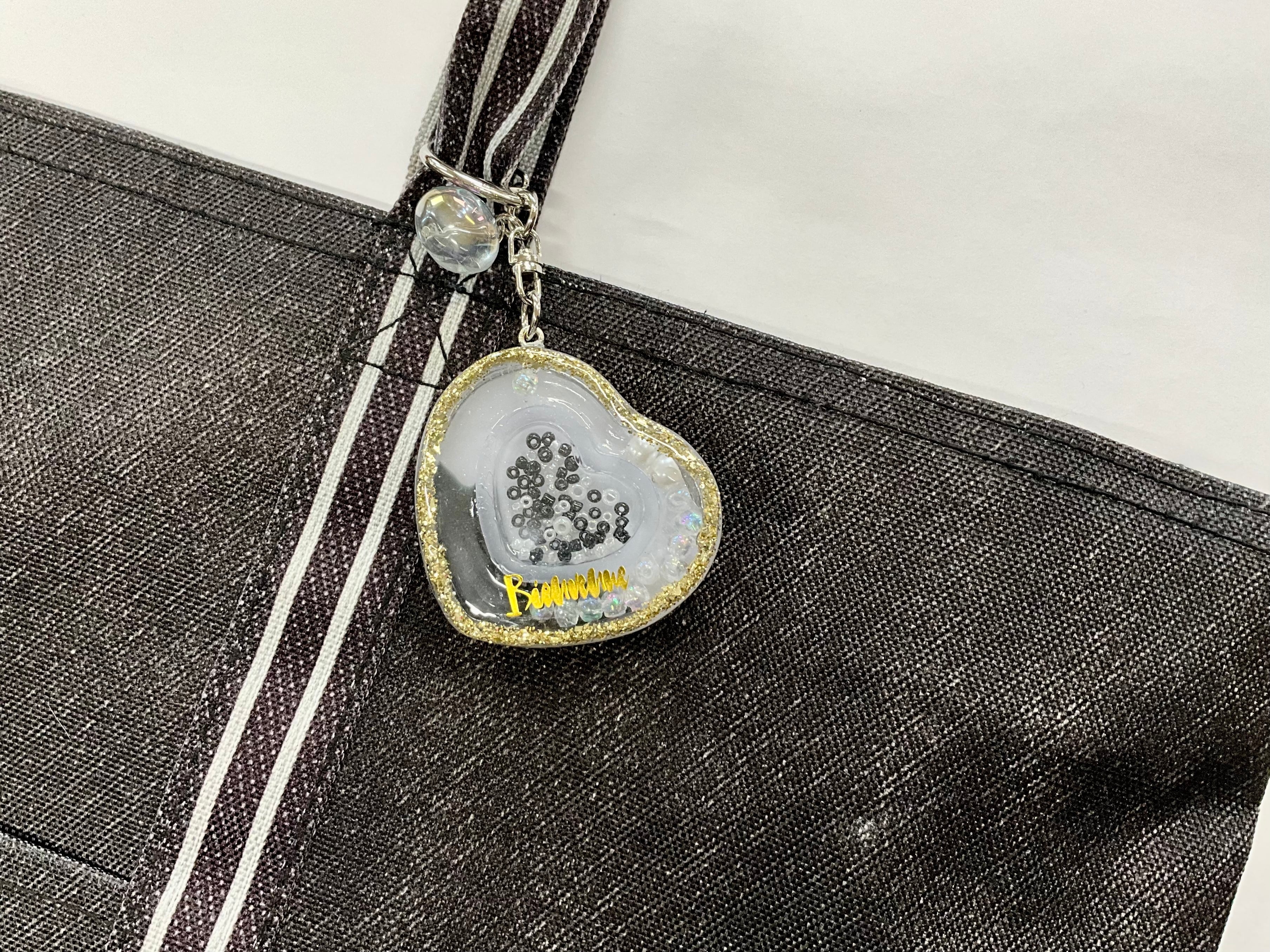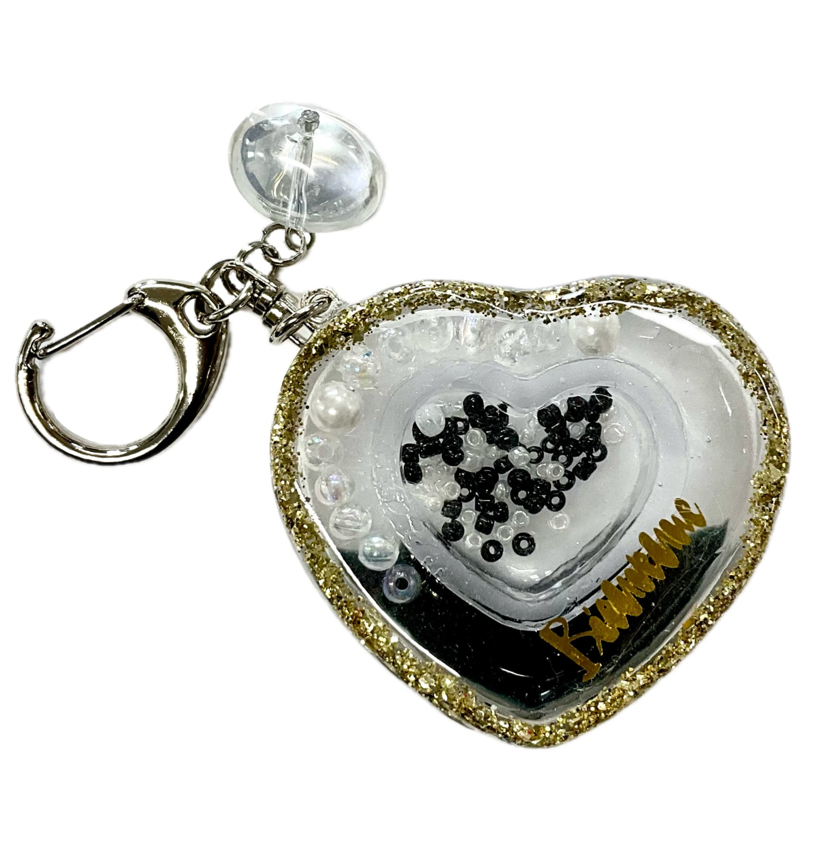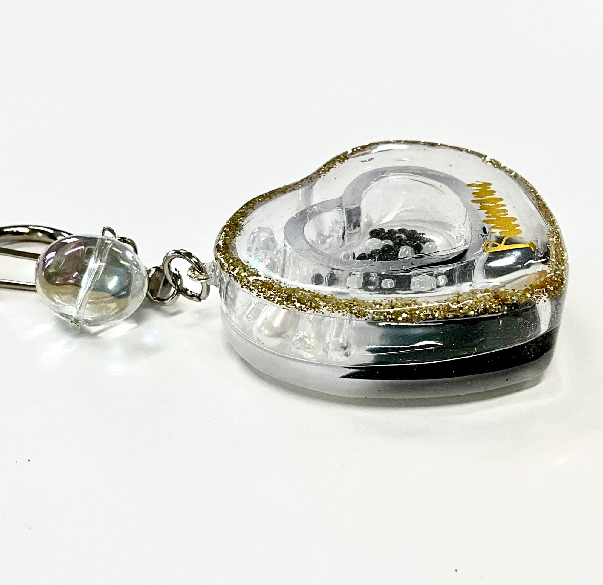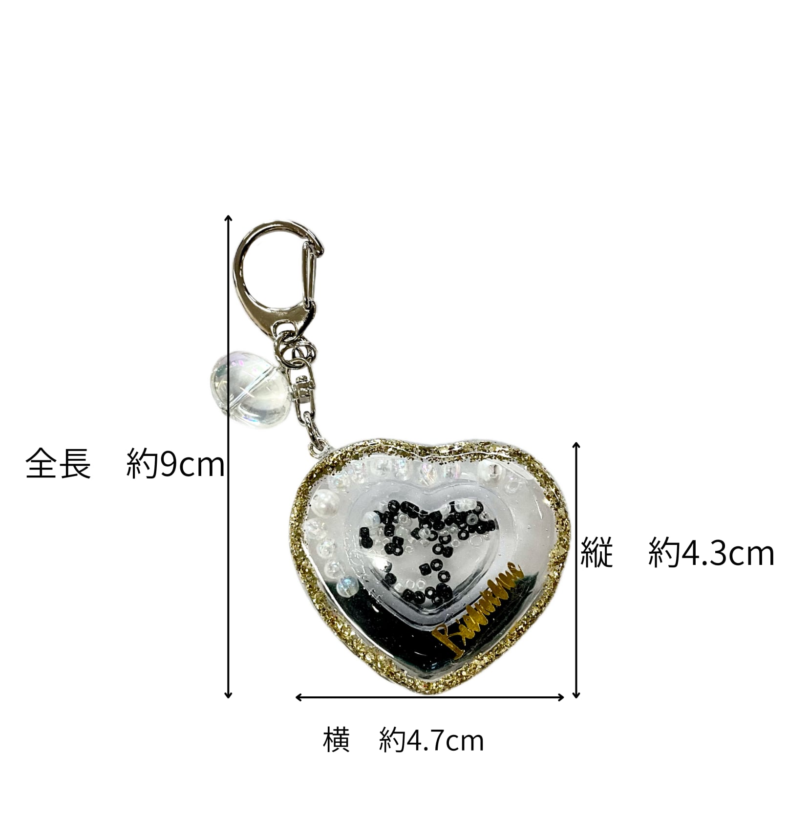 ハート型のシェイカーにパールと黒系のビーズを閉じ込めてゴールドのラメでふちどりがしてあり、大人っぽく上品な仕上がりに!!