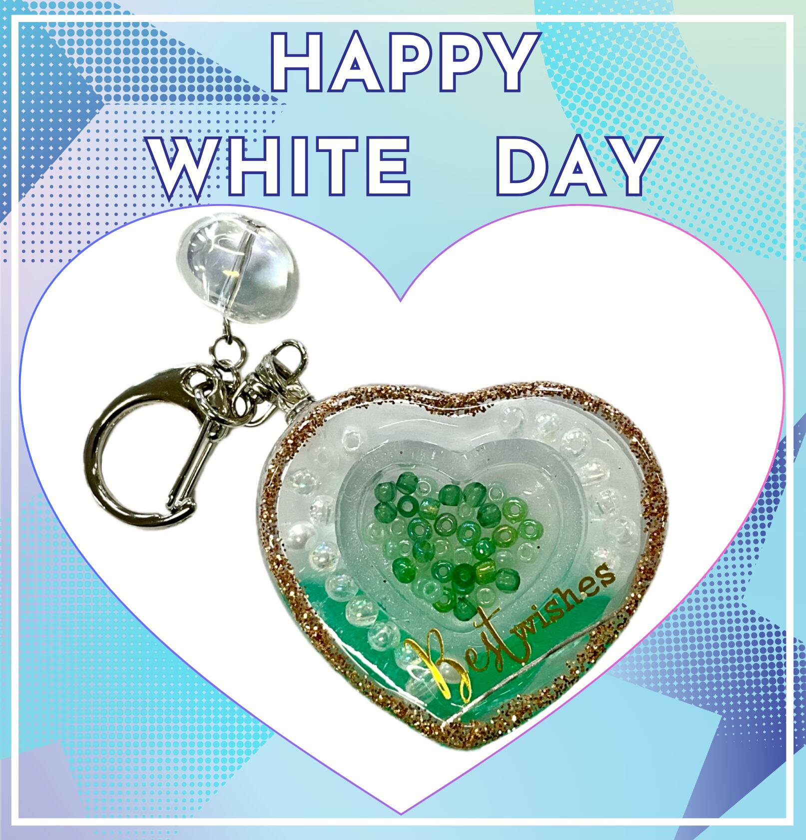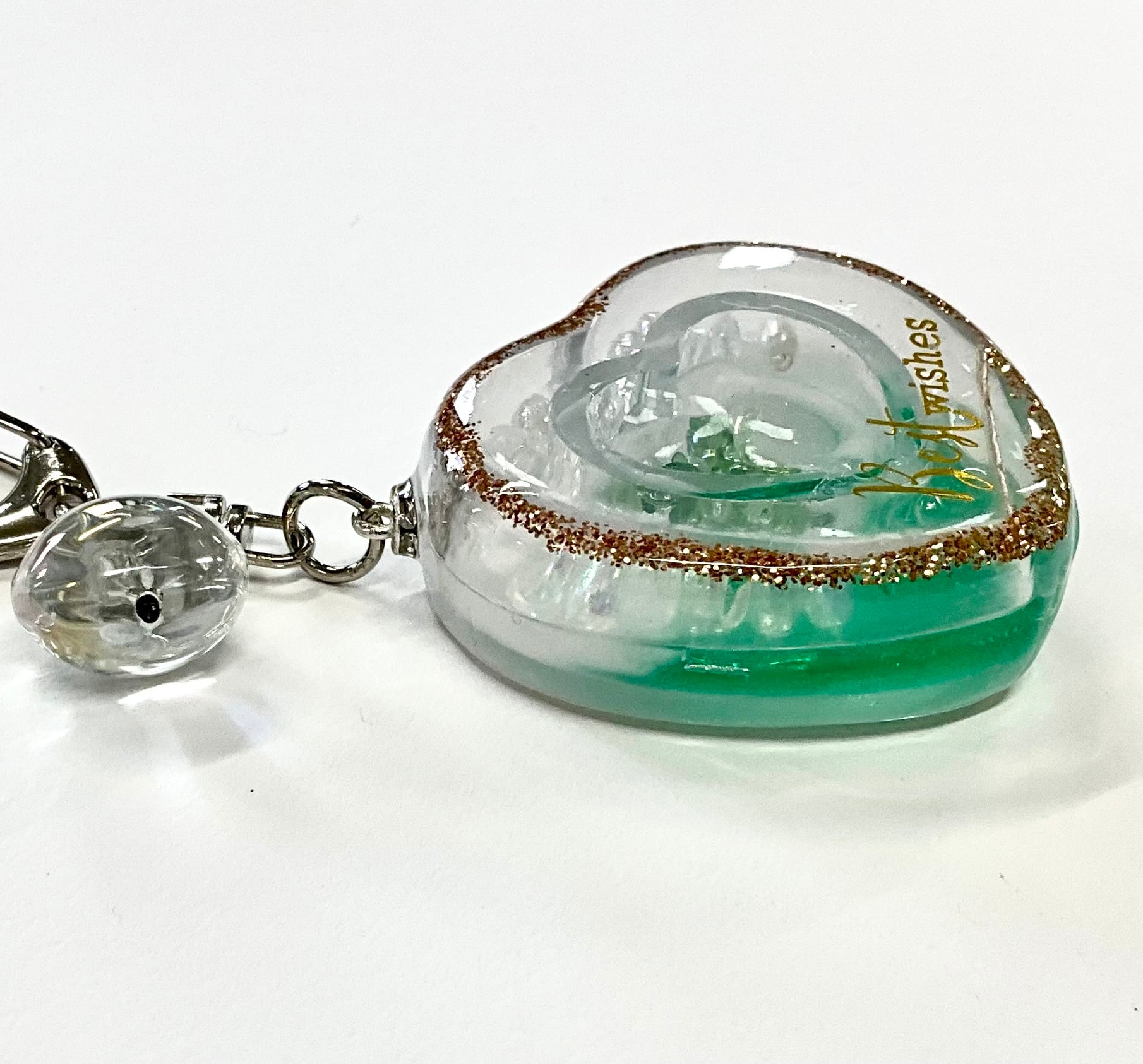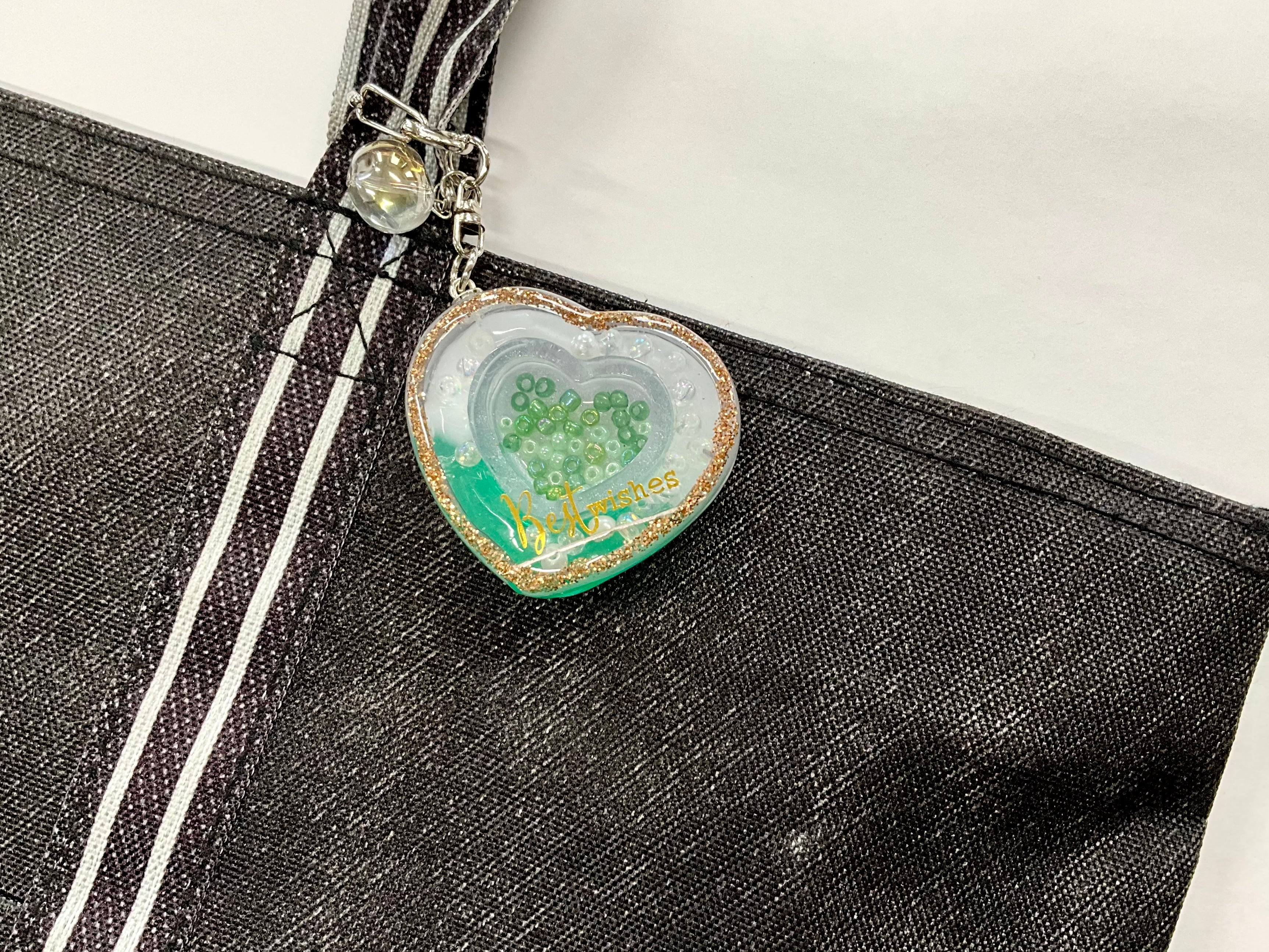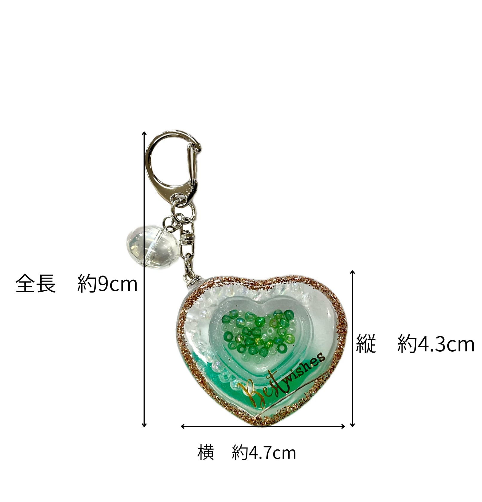 ハート型のシェイカーにパールとグリーン系のビーズを閉じ込めてピンクゴールドのラメでふちどりし、大人っぽく上品な仕上がりに!!