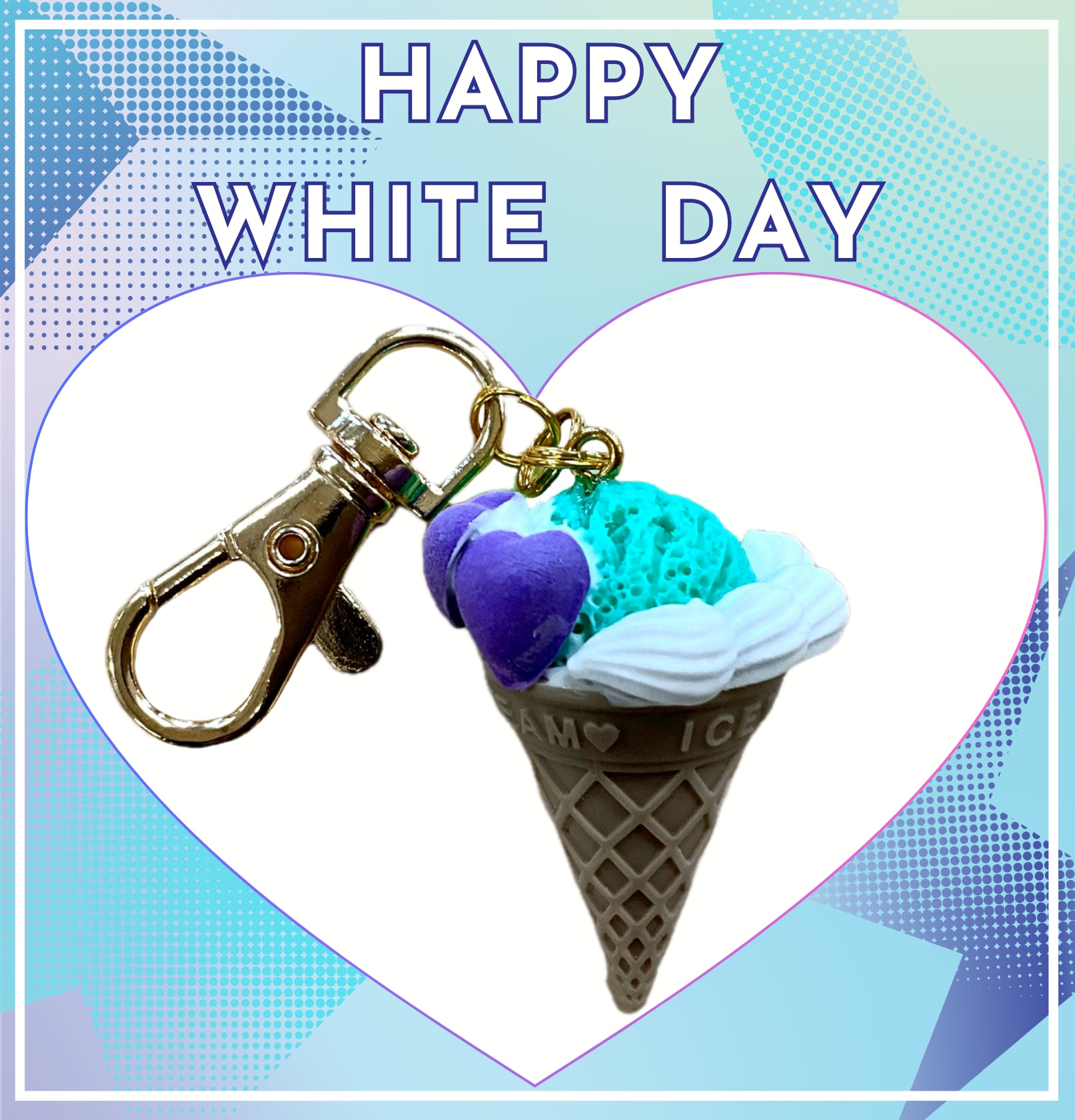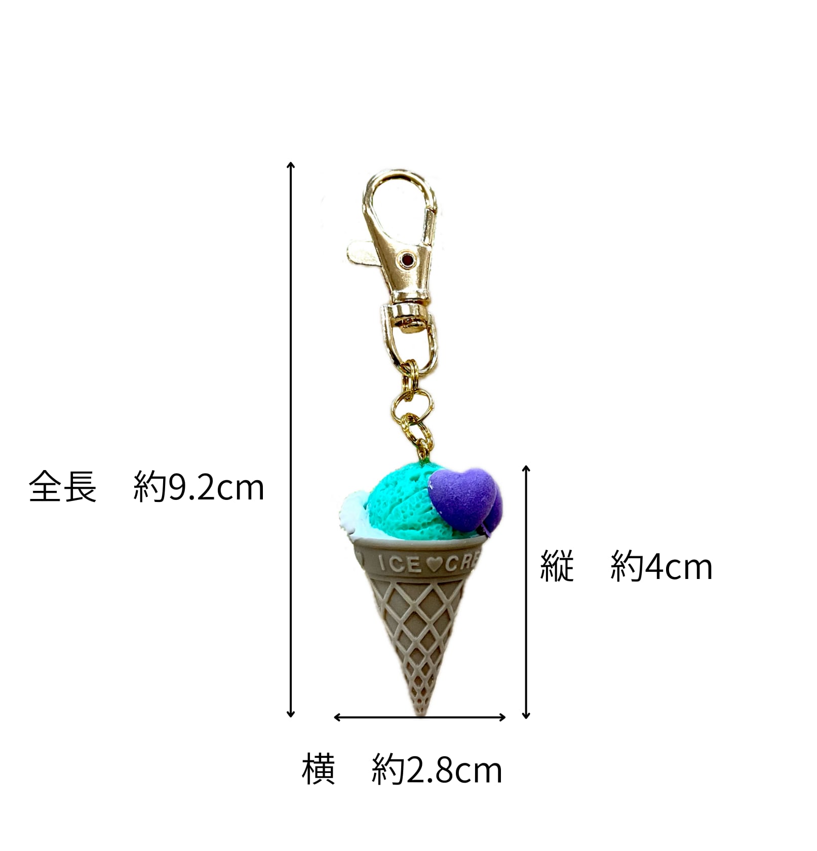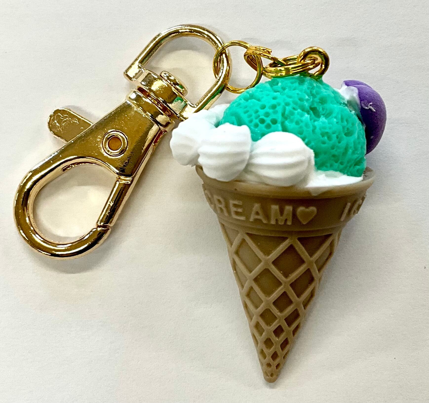 ミントのアイスにハートのマシュマロをトッピングしたアイスクリームのキーホルダーです。