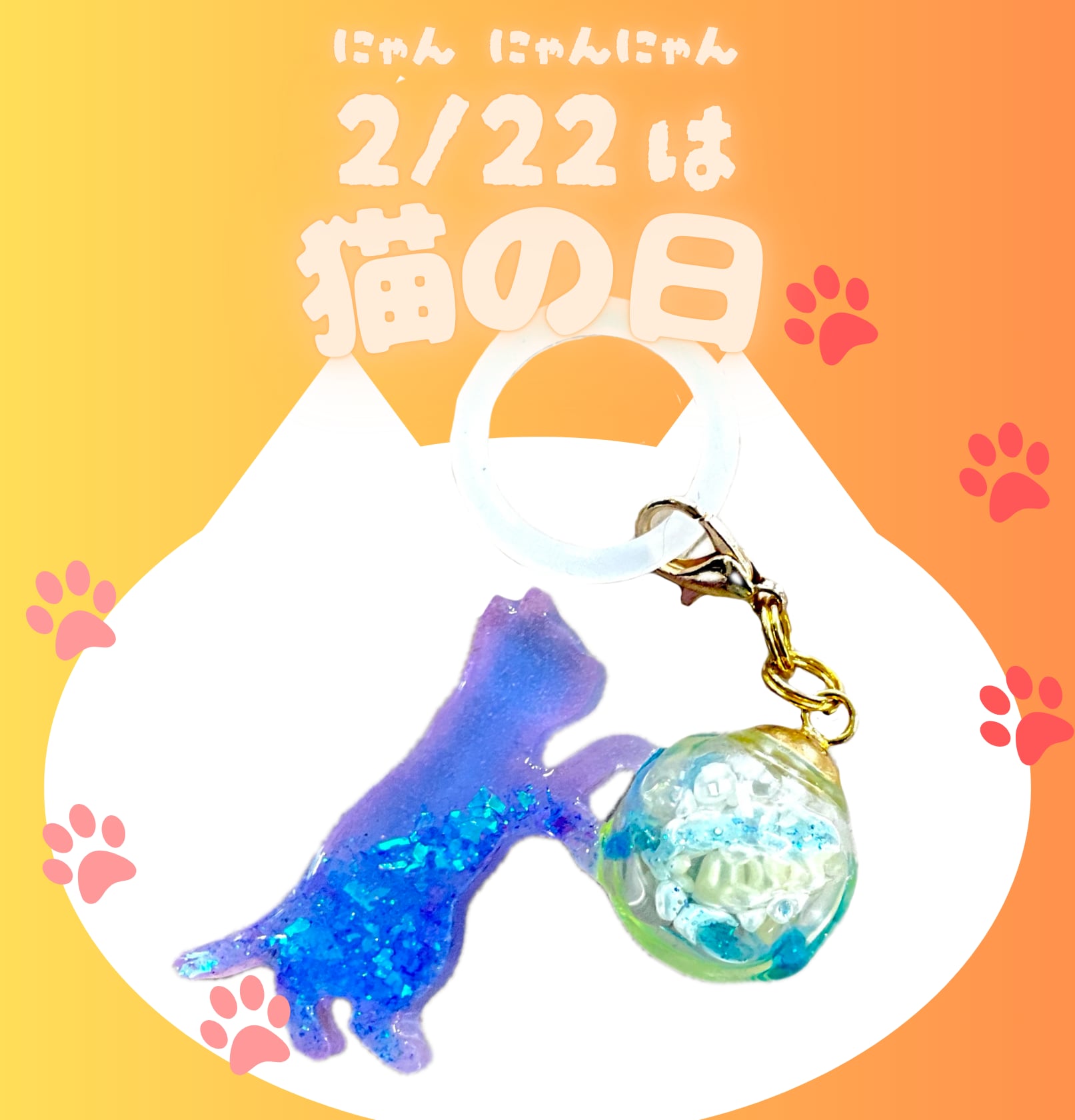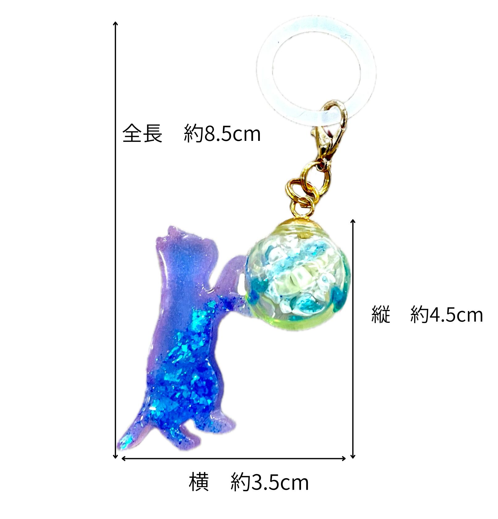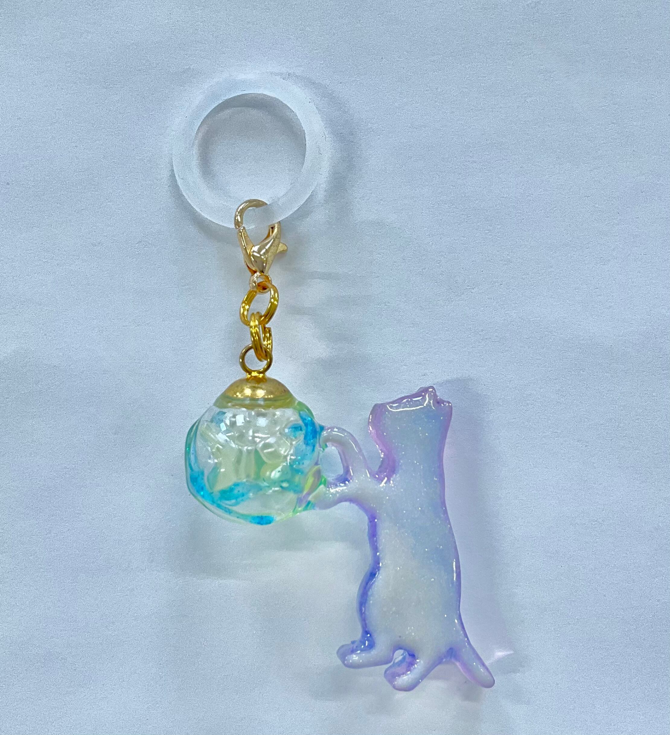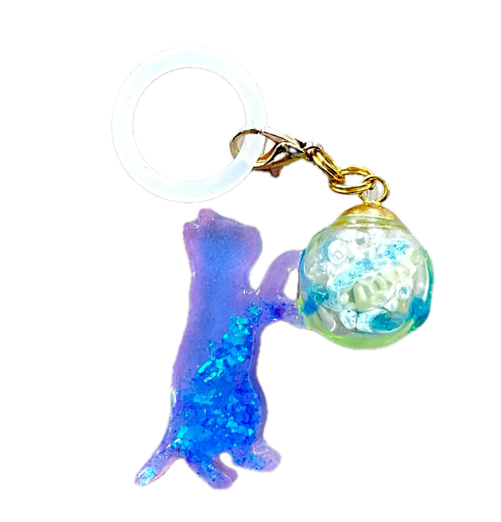 幻想的なブルーのグラデーションに、キラキラと輝くホログラムを閉じ込めた猫ちゃんが、どんよりとした雨空を明るく彩ります。