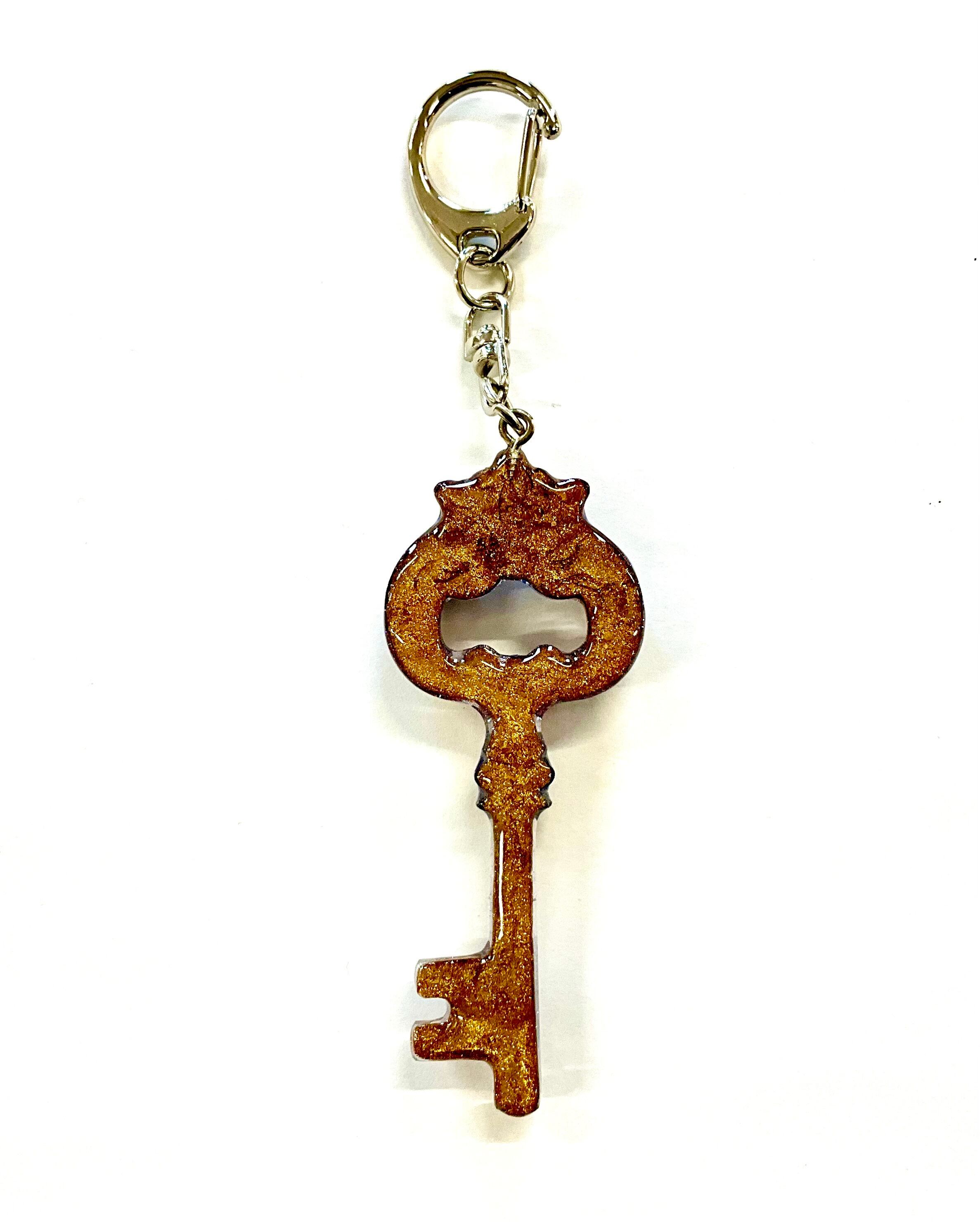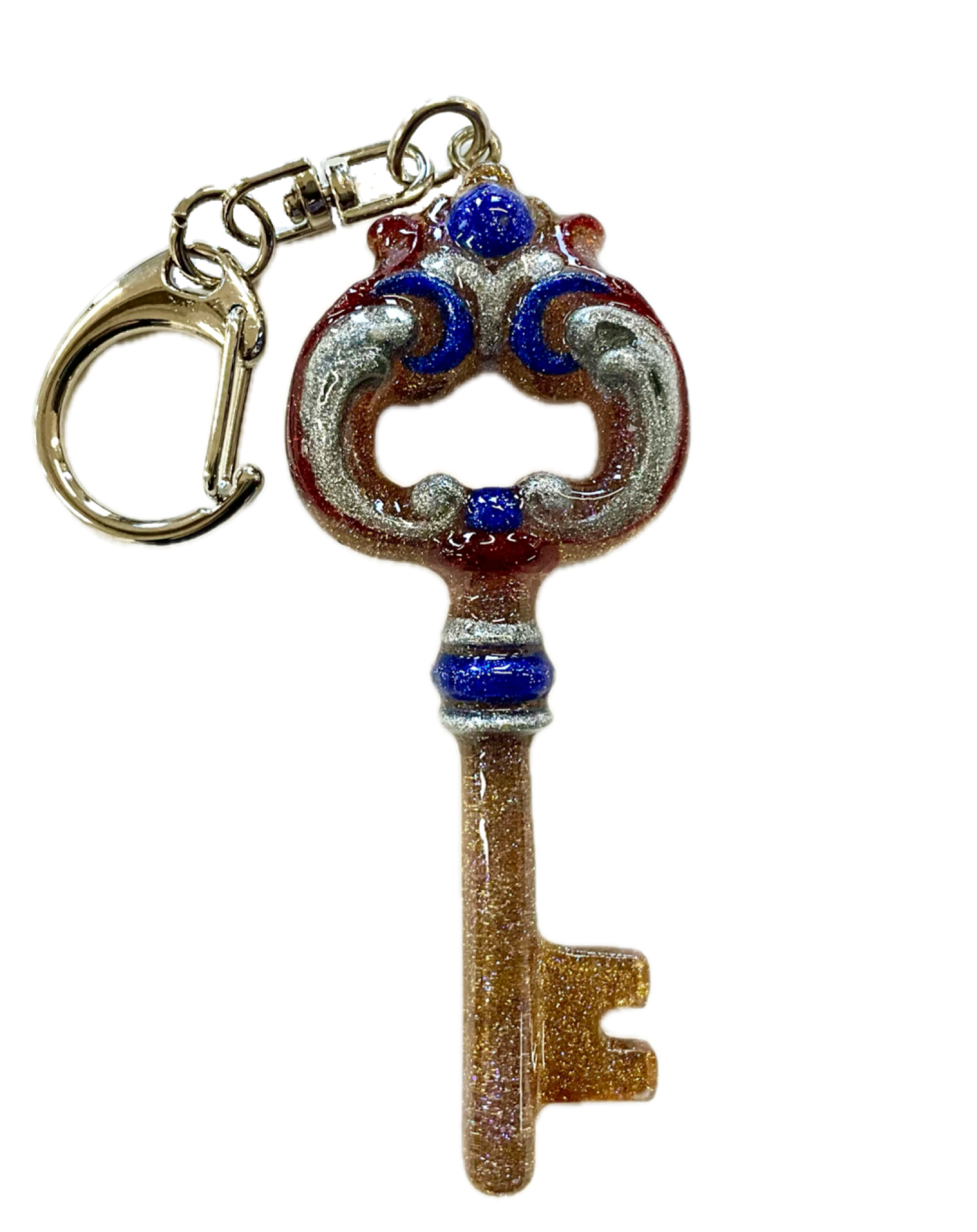 きらめくラメを閉じ込めた、鍵モチーフのレジンキーホルダーです。
