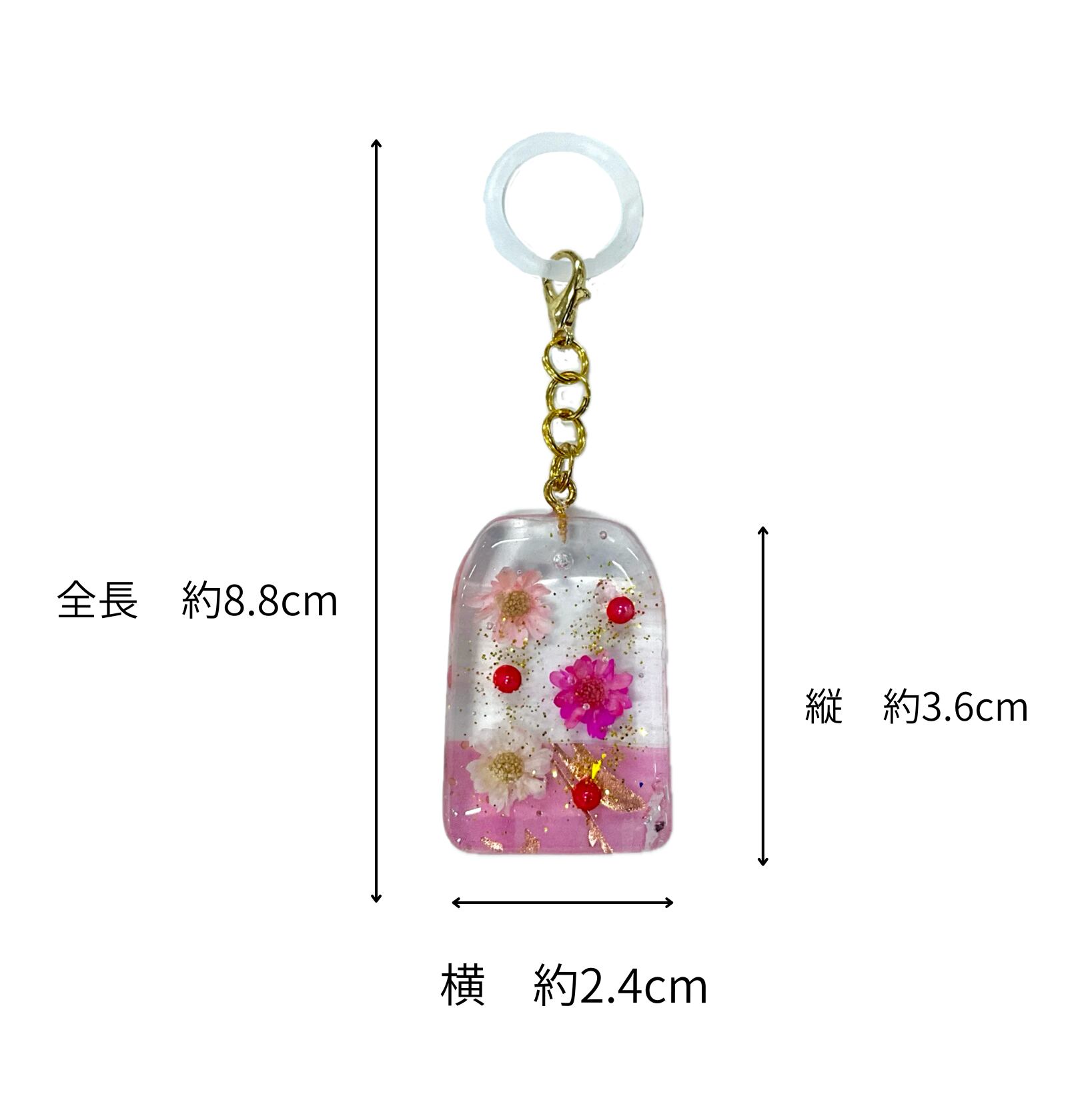 お守りのようなアーチ型のフォルムに、ピンクや白のドライフラワーを閉じ込め、