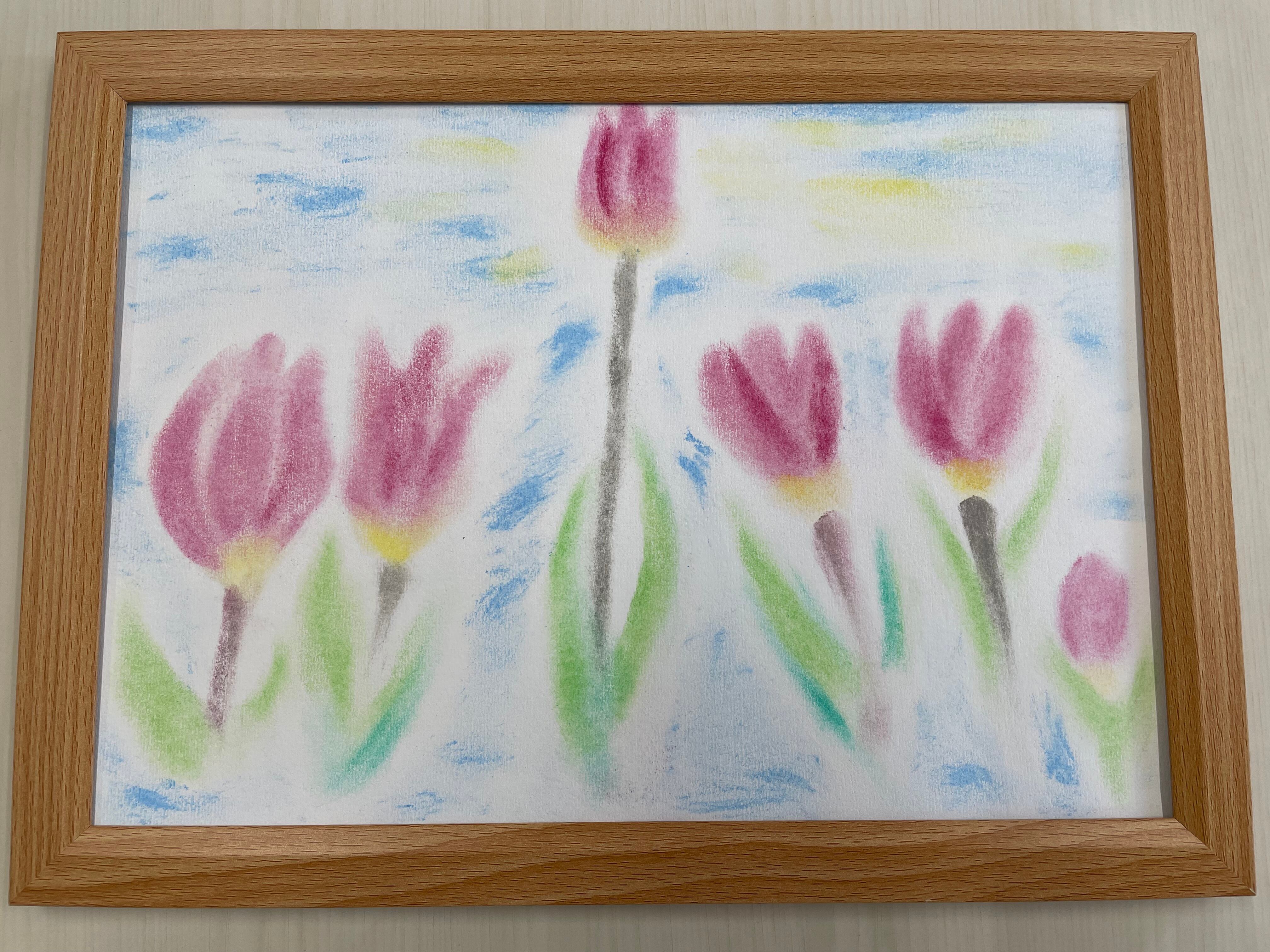 チューリップが咲き誇る美しいアート作品です。この作品は春の訪れを感じさせ、見る人の心に温かさと活力をもたらします。チューリップの繊細な色合いが、明るく華やかな雰囲気を演出し、どんな空間にも自然の美しさをプラスします。