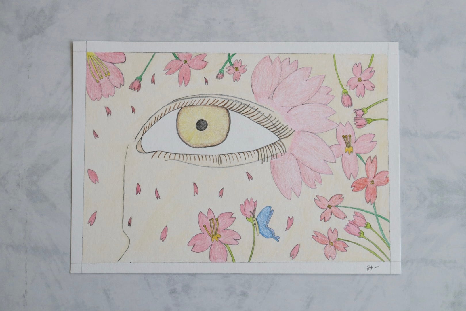 色とりどりの可憐な花々に囲まれた美しいアート作品で、大きな瞳は花の妖精の瞳です。